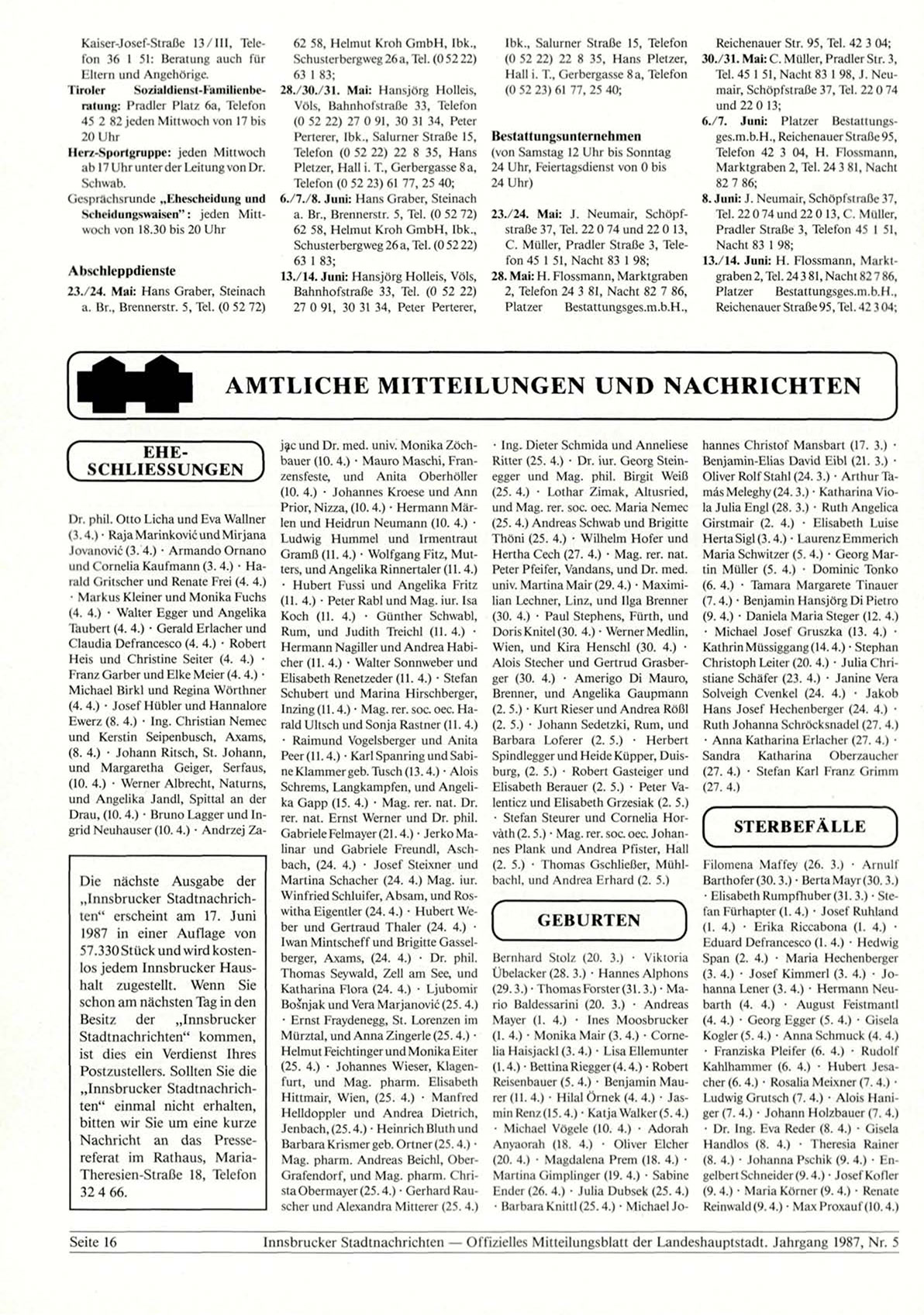 Innsbrucker Stadtnachrichten — Offizielles Mitteilungsblatt der Landeshauptstadt. Jahrgang 1987, Nr. 5