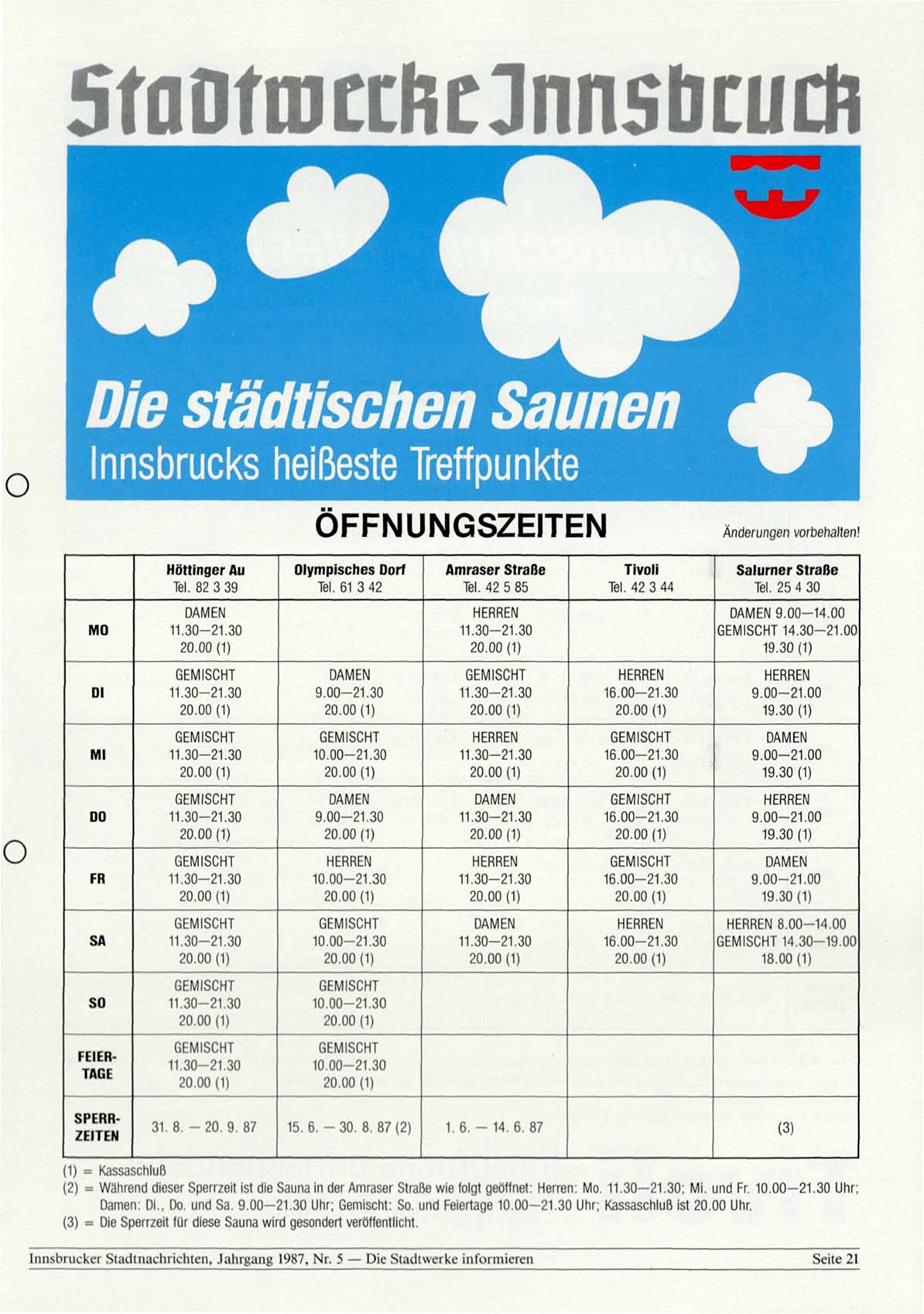 (2) = Während dieser Sperrzeit ist die Sauna in der Amraser Straße wie folgt geöffnet: Herren: Mo. 11.30-21.30; Mi. und Fr. 1 0 . 0 0 - 2 1 . 3 0 Uhr;