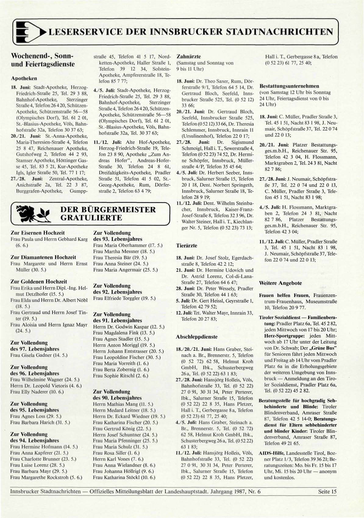 Innsbrucker Stadtnachrichten — Offizielles Mitteilungsblatt der Landeshauptstadt. Jahrgang 1987, Nr. 6