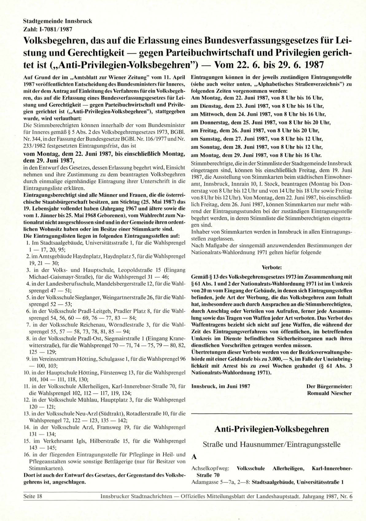 Volksbegehren, das auf die Erlassung eines Bundesverfassungsgesetzes für I^istung und Gerechtigkeit — gegen Parteibuchwirtschaft und Privilegien gerichtet ist („Anti-Privilegien-Volksbegehren") — Vom 22. 6. bis 29. 6. 1987