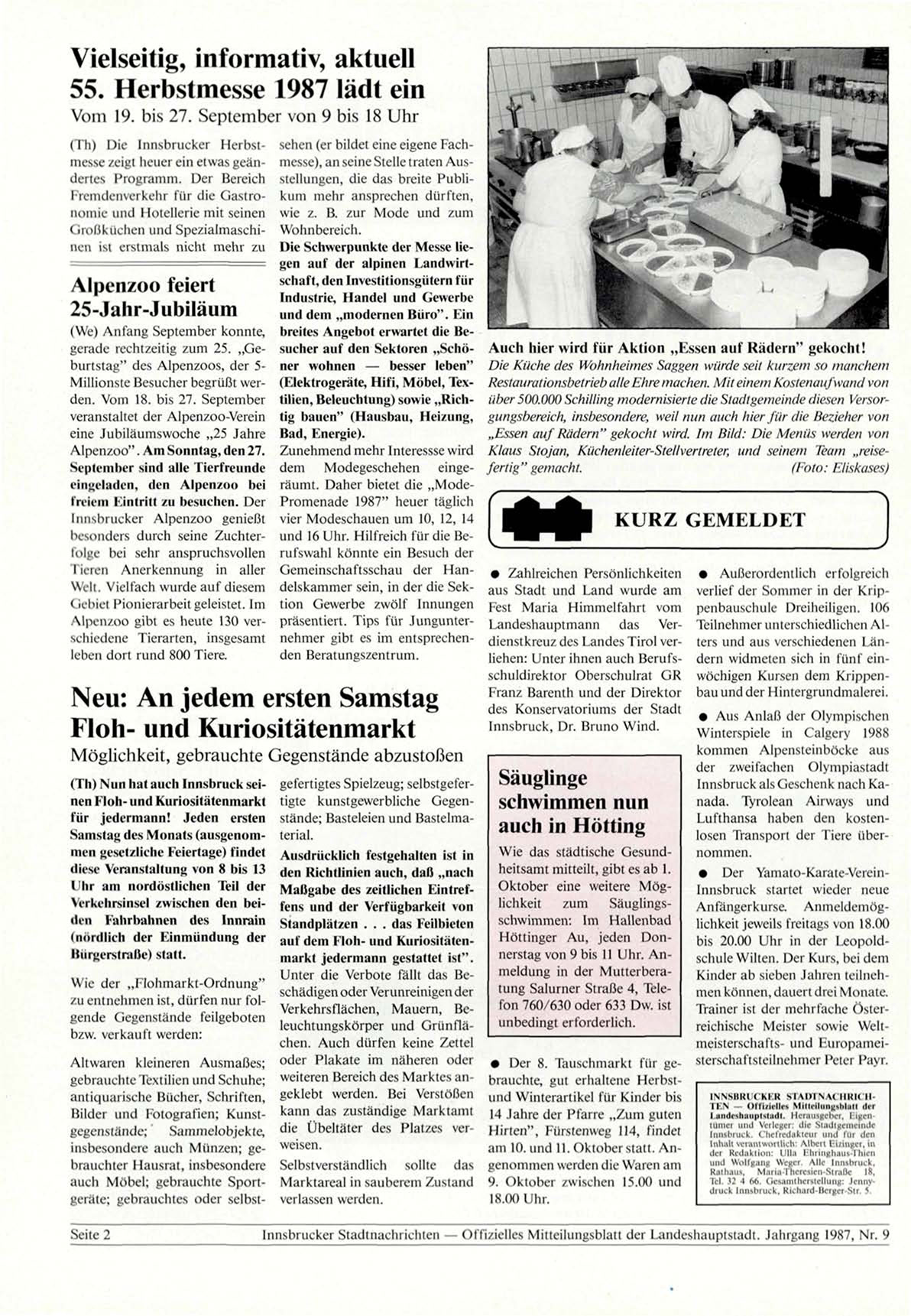 Innsbrucker Stadtnachrichten — Offizielles Mitteilungsblatt der Landeshauptstadt. Jahrgang 1987, Nr. 9