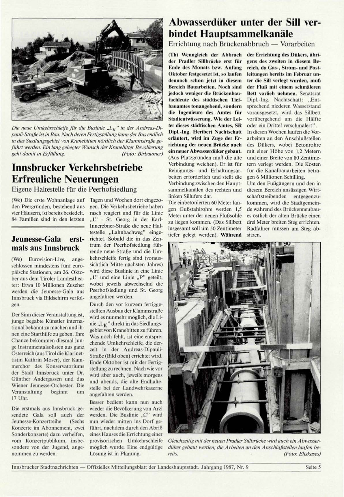 Innsbrucker Stadtnachrichten — Offizielles Mitteilungsblatt der Landeshauptstadt. Jahrgang 1987, Nr. 9