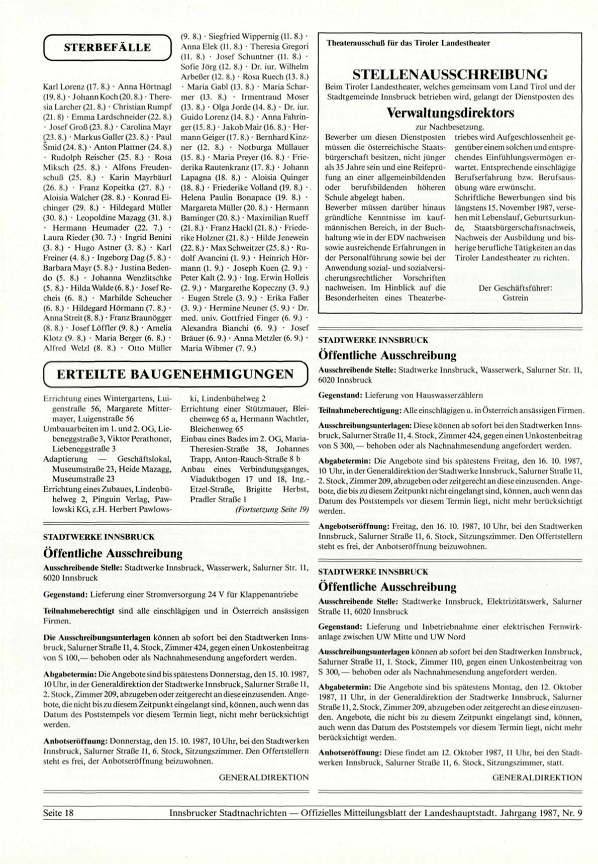 Innsbrucker Stadtnachrichten — Offizielles Mitteilungsblatt der Landeshauptstadt. Jahrgang 1987, Nr. 9