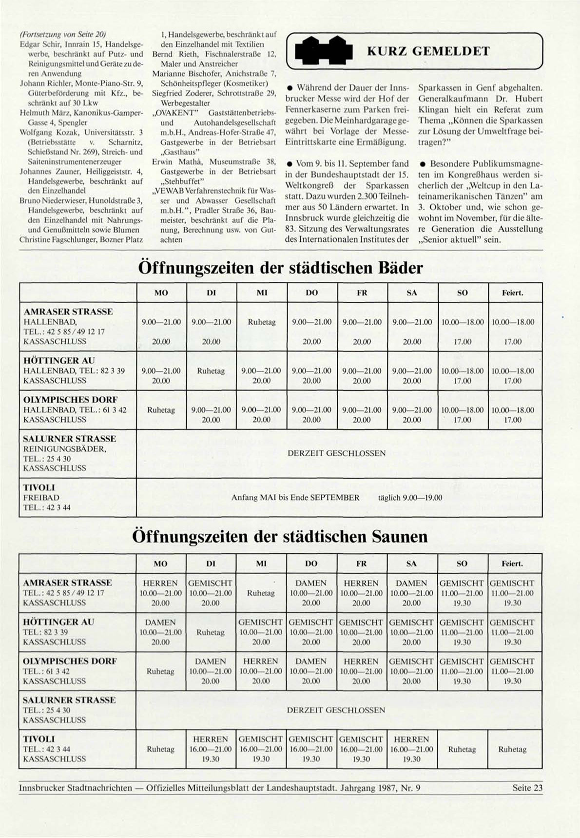 Innsbrucker Stadtnachrichten — Offizielles Mitteilungsblatt der Landeshauptstadt. Jahrgang 1987, Nr. 9