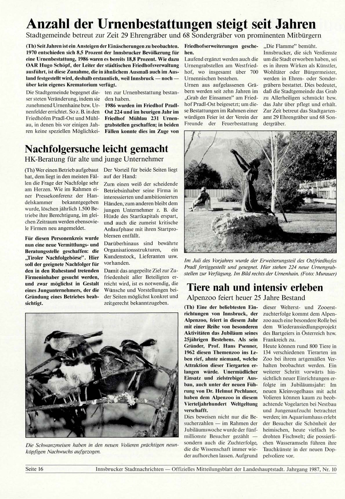 Innsbrucker Stadtnachrichten — Offizielles Mitteilungsblatt der Landeshauptstadt. Jahrgang 1987, Nr. 10