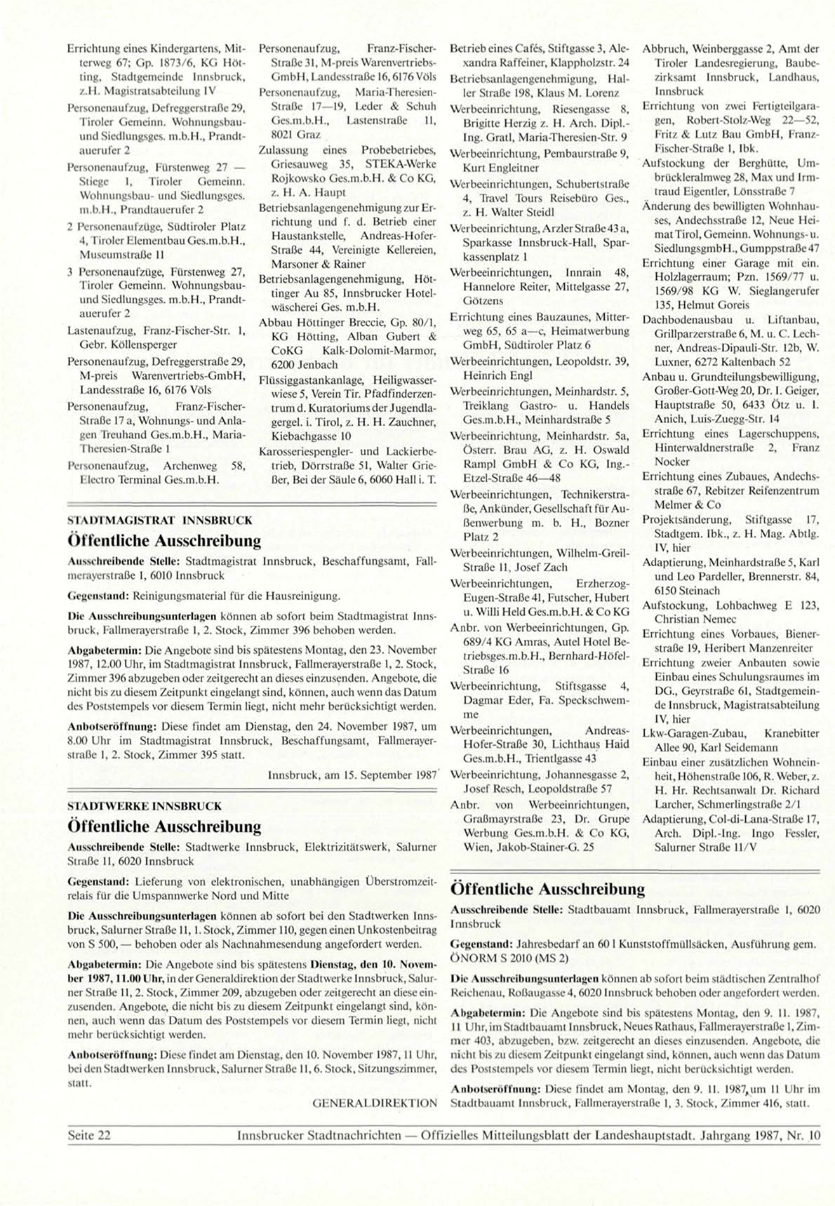 Innsbrucker Stadtnachrichten — Offizielles Mitteilungsblatt der Landeshauptstadt. Jahrgang 1987, Nr. 10