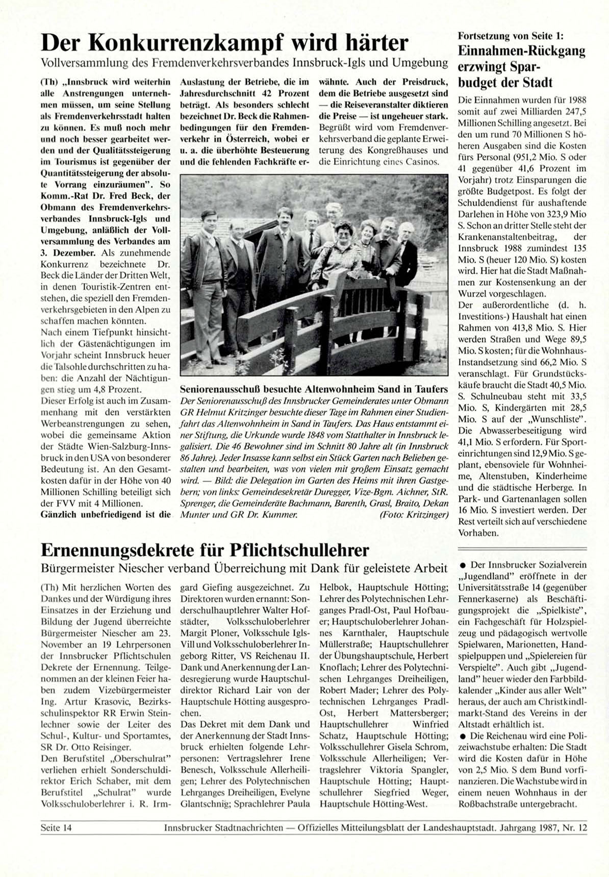 Innsbrucker Stadtnachrichten — Offizielles Mitteilungsblatt der Landeshauptstadt. Jahrgang 1987, Nr. 12