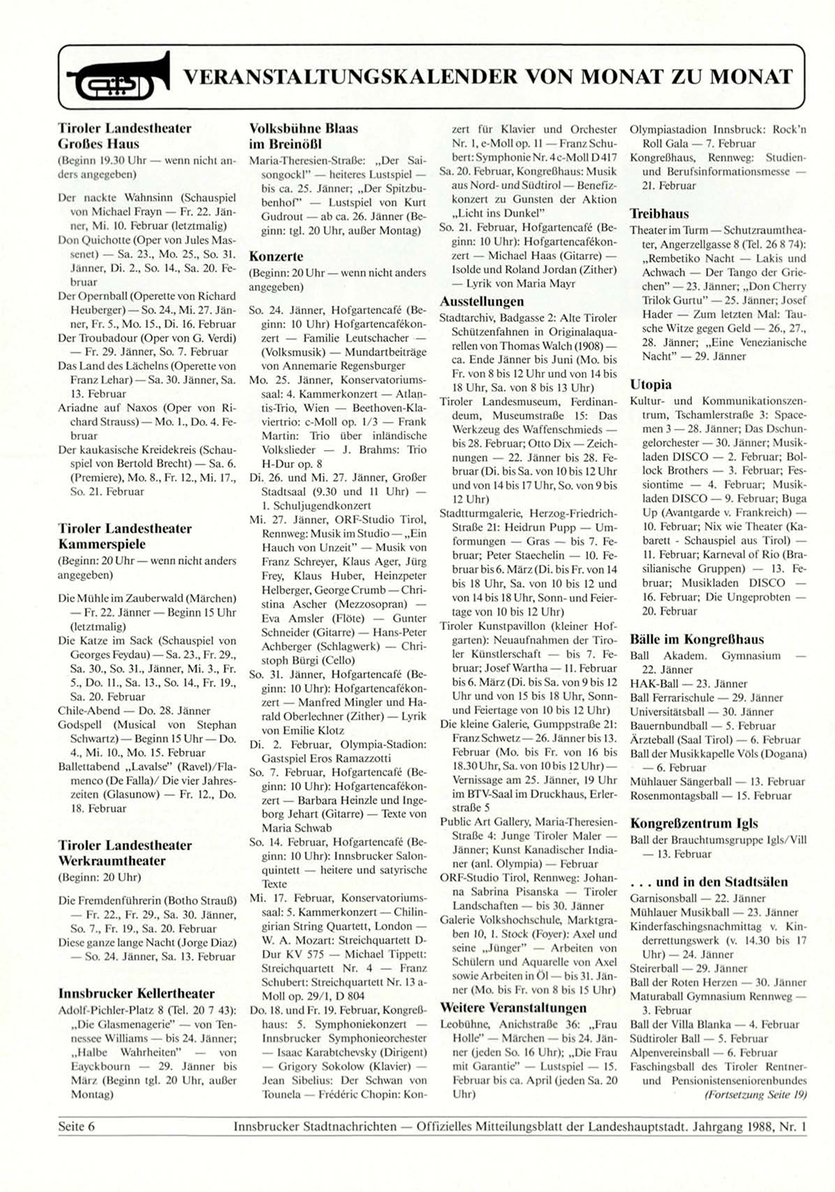 Innsbrucker Stadtnachrichten — Offizielles Mitteilungsblatt der Landeshauptstadt. Jahrgang 1988, Nr. 1