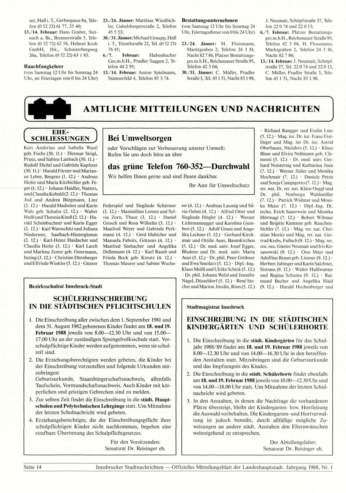 Innsbrucker Stadtnachrichten — Offizielles Mitteilungsblatt der Landeshauptstadt. Jahrgang 1988, Nr. 1