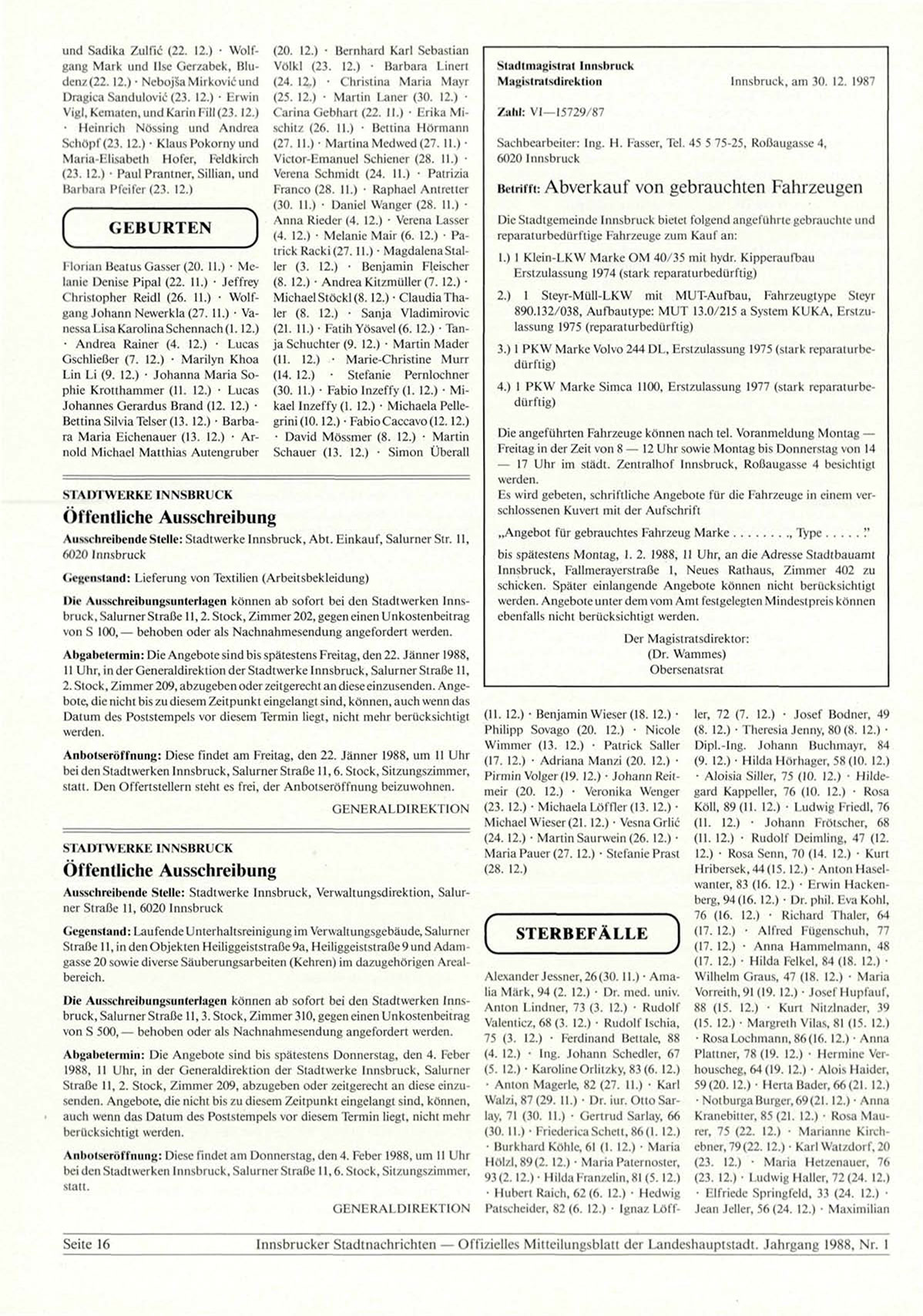 Innsbrucker Stadtnachrichten — Offizielles Mitteilungsblatt der Landeshauptstadt. Jahrgang 1988, Nr. 1