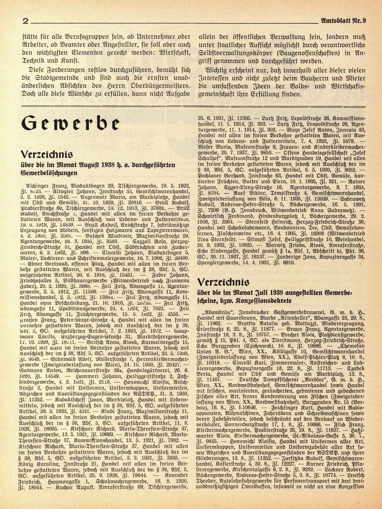 25. 6. 1931. ZI. 11305. — Lurtz Fritz. Lepoldstraße 26. Kommissionshandel. 11. 1. 1914, Zl. 303. — Lurtz Fritz. Leopoldstratze 26, Agenturgewerbe. 11. 1. 1914, Zl. 302. — Mayr Josef Anton, Innrain 33,