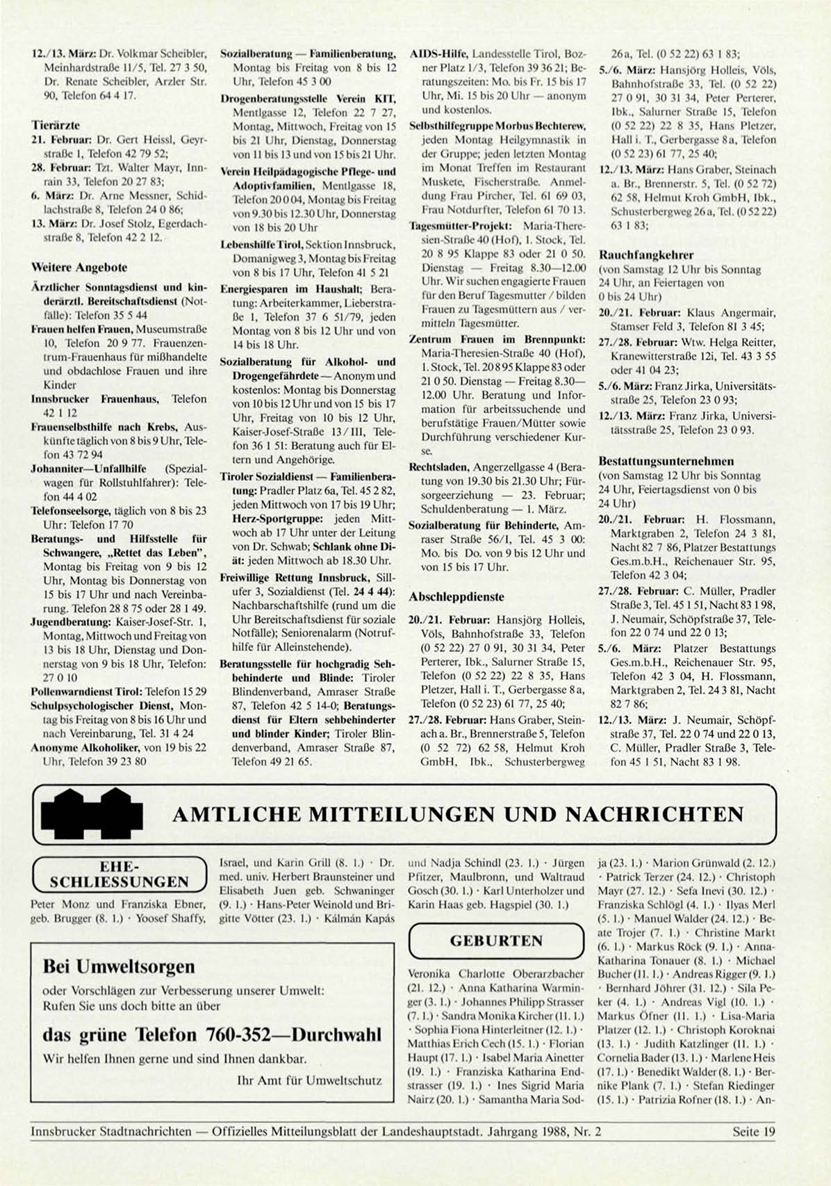 Innsbrucker Stadtnachrichten — Offizielles Mitteilungsblatt der Landeshauptstadt. Jahrgang 1988, Nr. 2