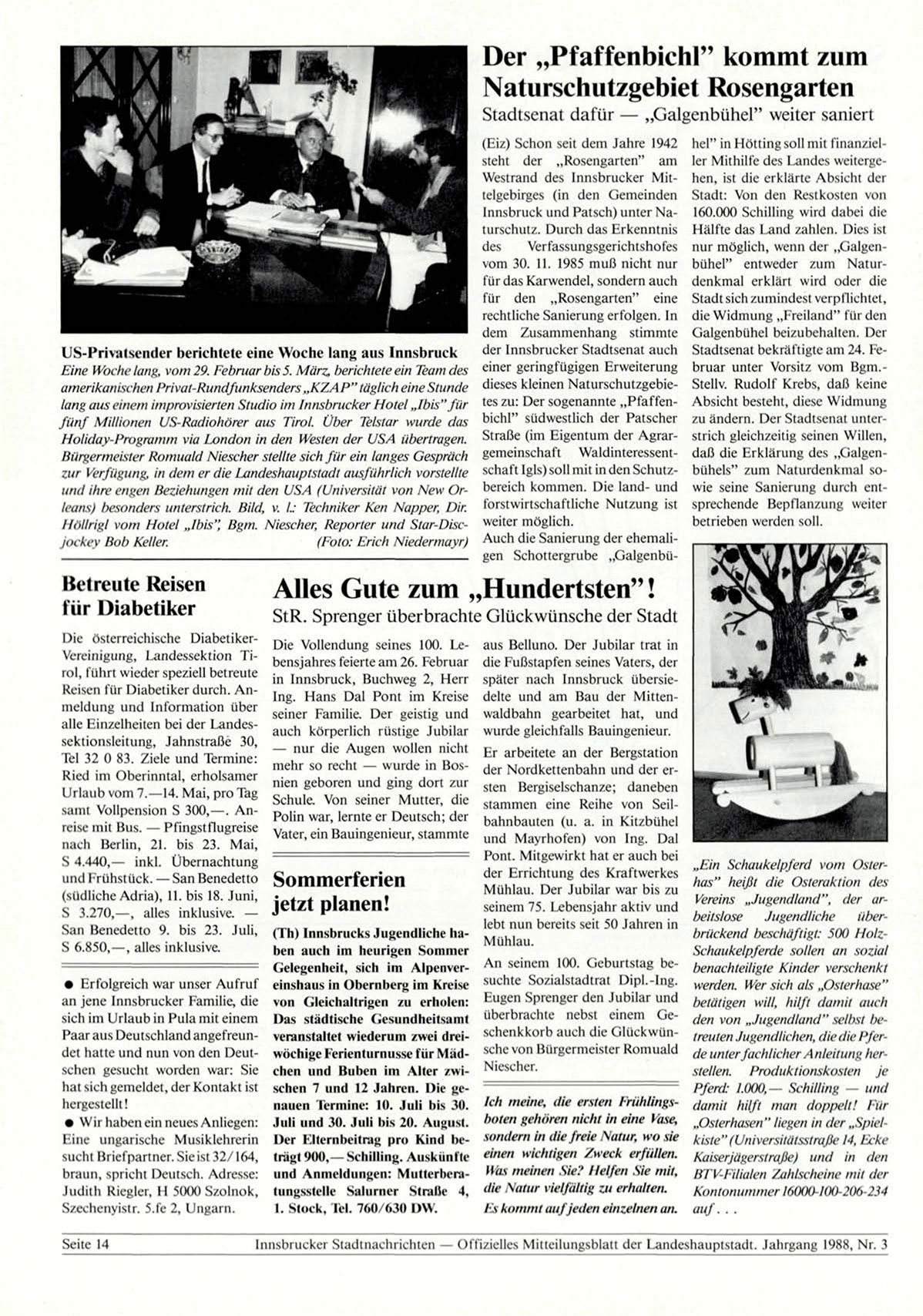 amerikanischen Privat-Rundfunksenders „KZAP" täglich eine Stunde dieses kleinen Naturschutzgebielang aus einem improvisierten Studio im Innsbrucker Hotel „Ibis" für tes zu: Der sogenannte „Pfaffenfünf Millionen US-Radiohörer aus Tirol. Über Telstar wurde das bichl" südwestlich der Patscher
