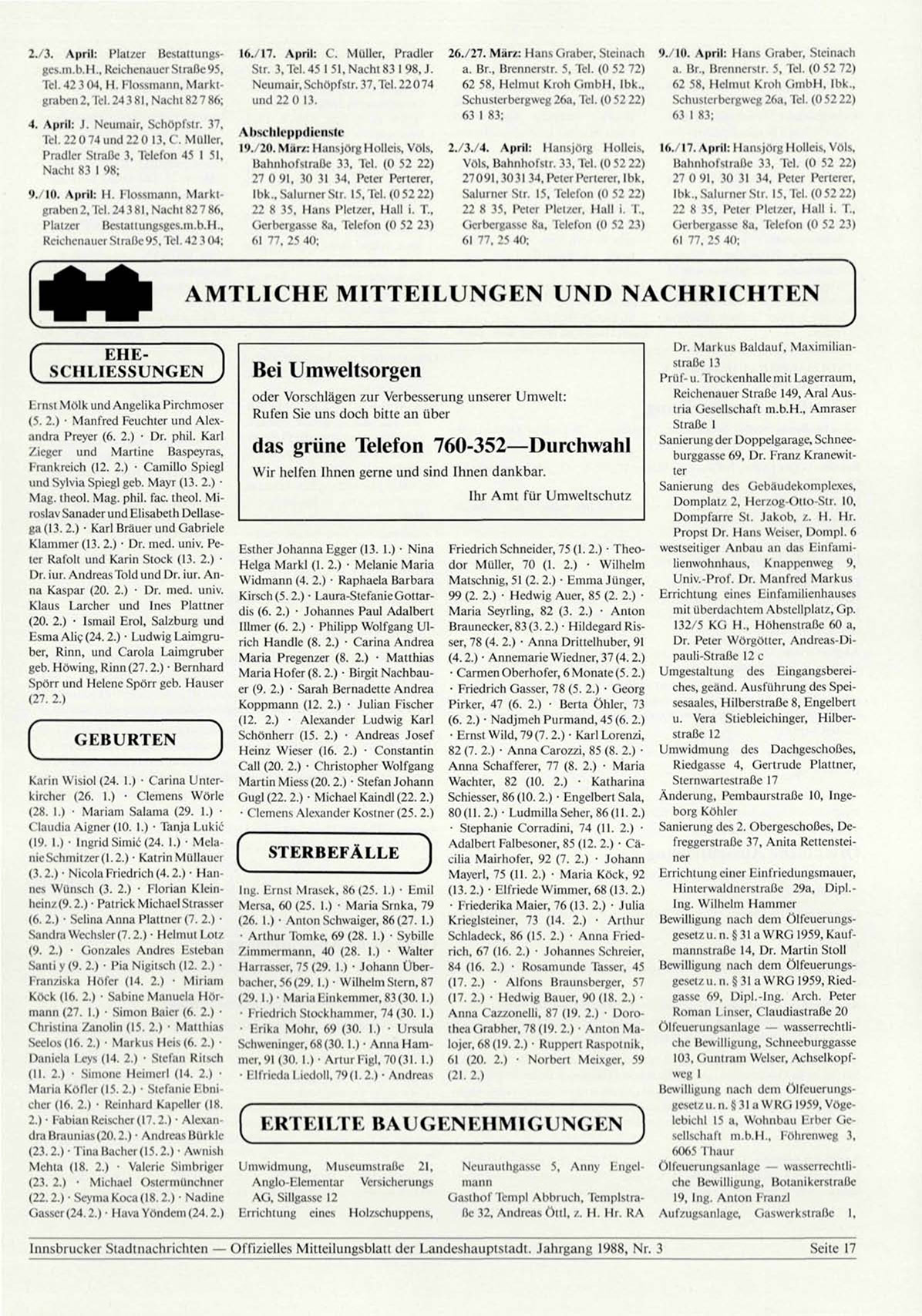 Innsbrucker Stadtnachrichten — Offizielles Mitteilungsblatt der Landeshauptstadt. Jahrgang 1988, Nr. 3