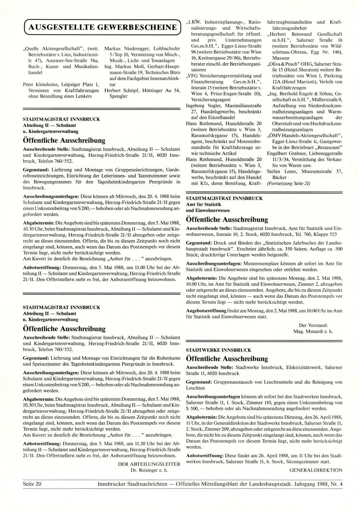 Innsbrucker Stadtnachrichten — Offizielles Mitteilungsblatt der Landeshauptstadt. Jahrgang 1988, Nr. 4