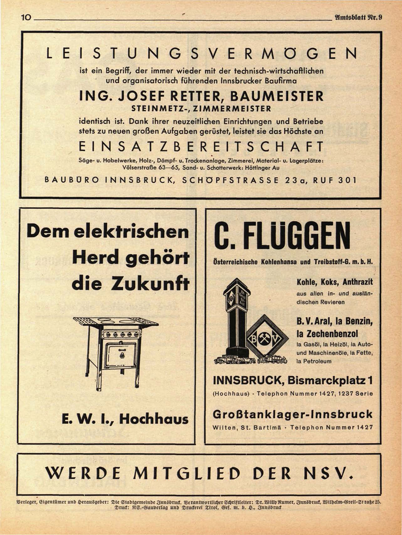 Verleger, Eigentümer und Herausgeber: Die Stadtgemeinde Innsbruck. Verantwortlicher Schriftleiter: Dr. Willy Rumer. Innsbruck, Wilhelm-Greil-St ratze 25.