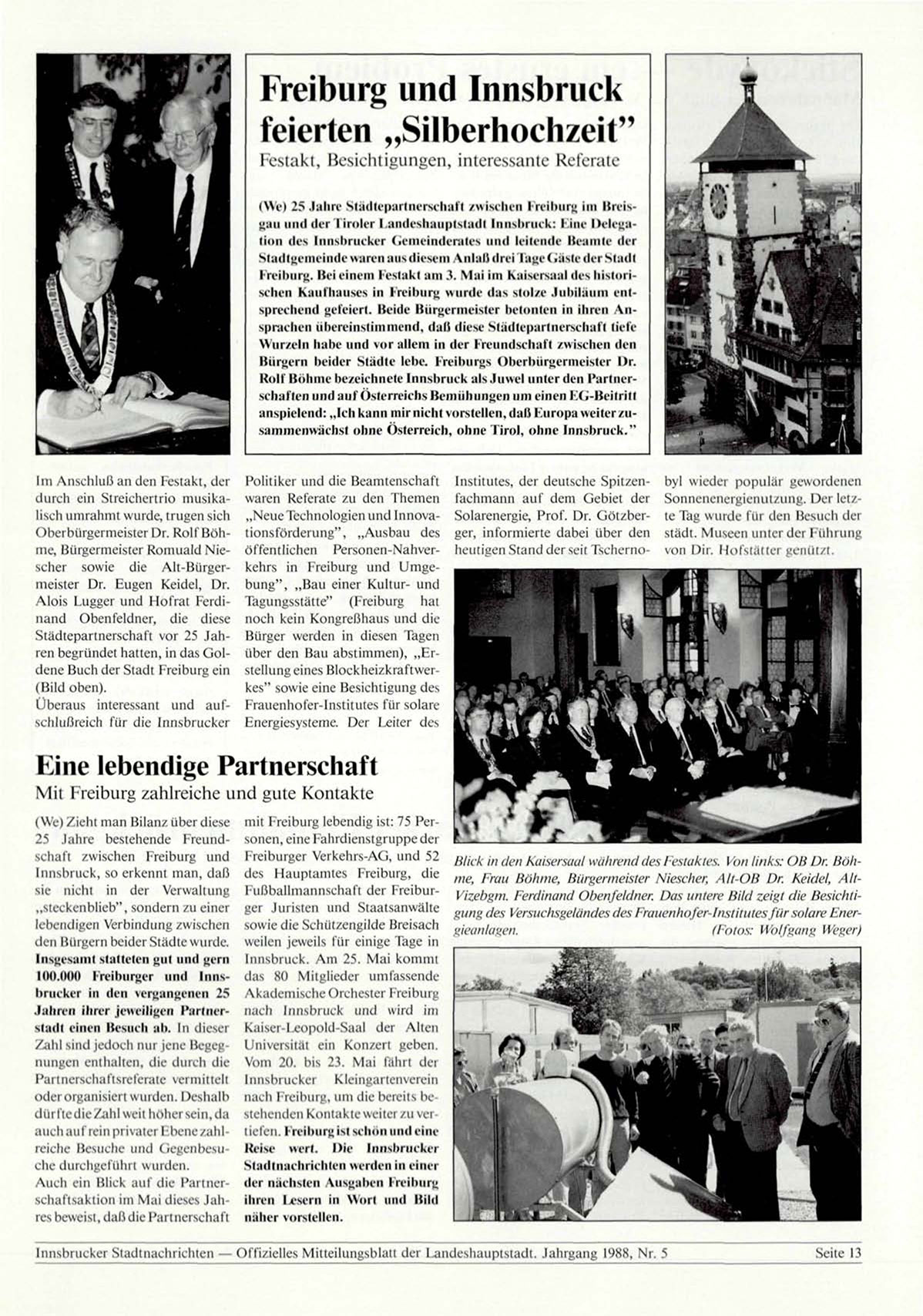 25 Jalire Städtepartnerschaft /wischen Freiburg im BreisUiiii 1111 tt (Irr I nnlei I aiulish a u p I sl :M 11 Innsbruck: Fine Delegation des liinshrucker denieindcralcs und leitende Beamte der