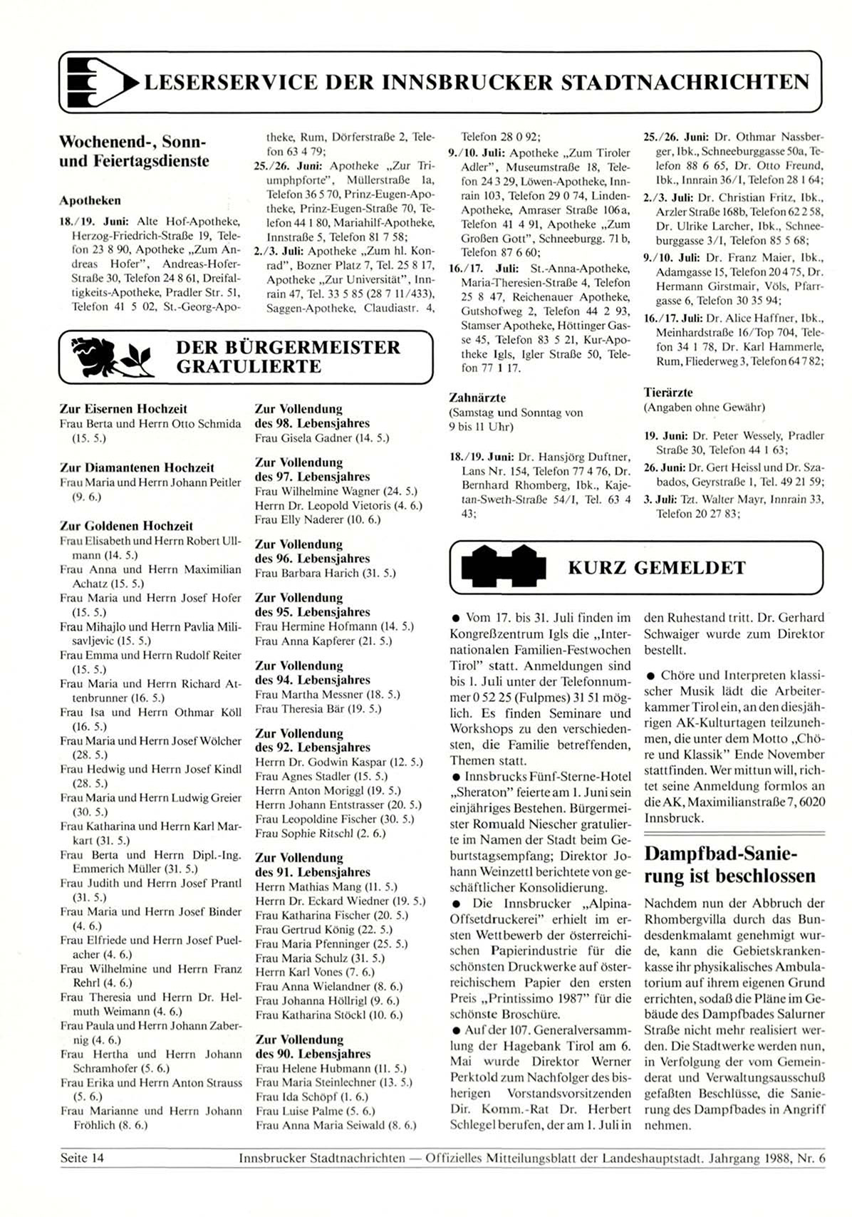 Innsbrucker Stadtnachrichten — Offizielles Mitteilungsblatt der Landeshauptstadt. Jahrgang 1988, Nr. 6