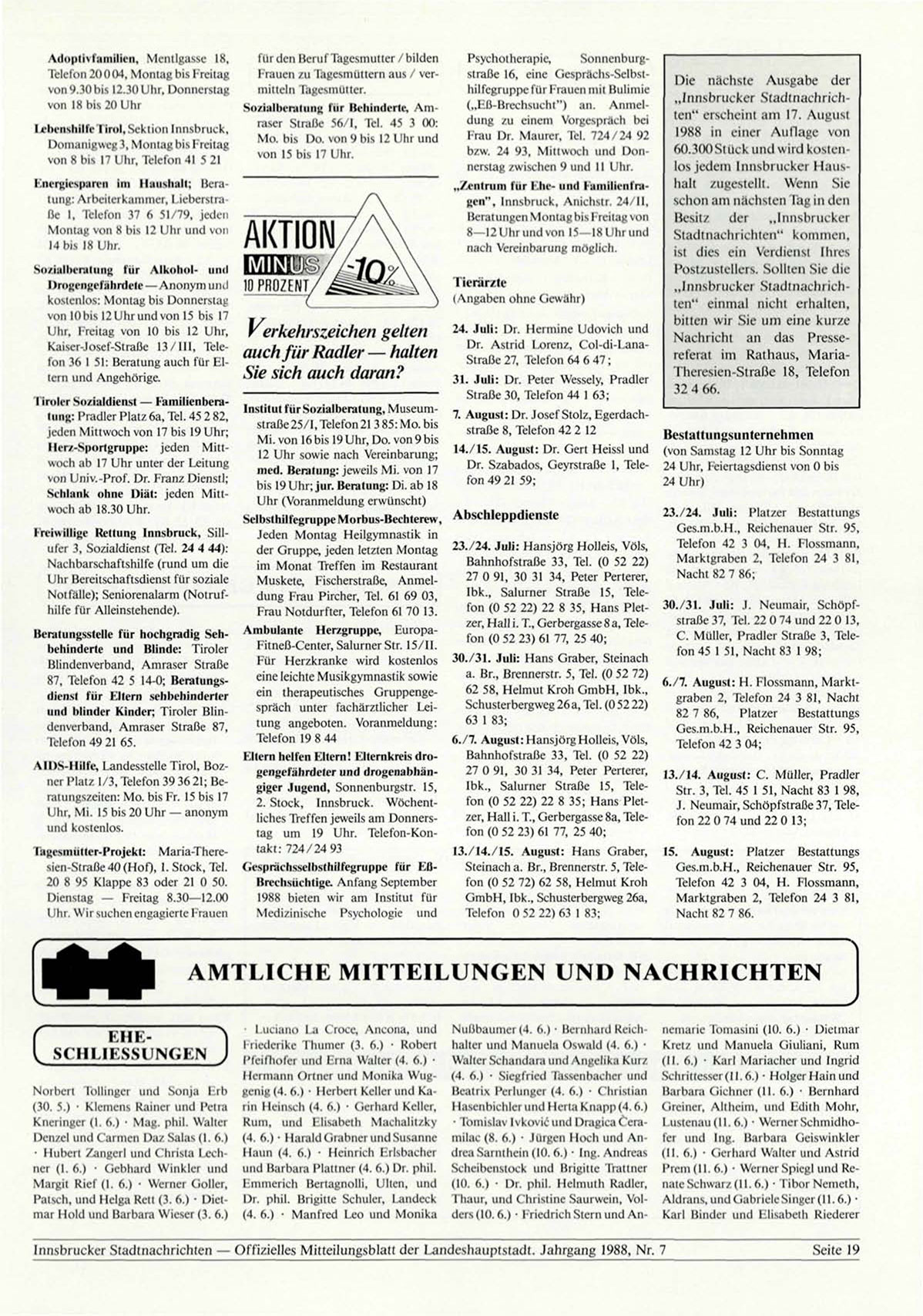 Innsbrucker Stadtnachrichten — Offizielles Mitteilungsblatt der Landeshauptstadt. Jahrgang 1988, Nr. 7