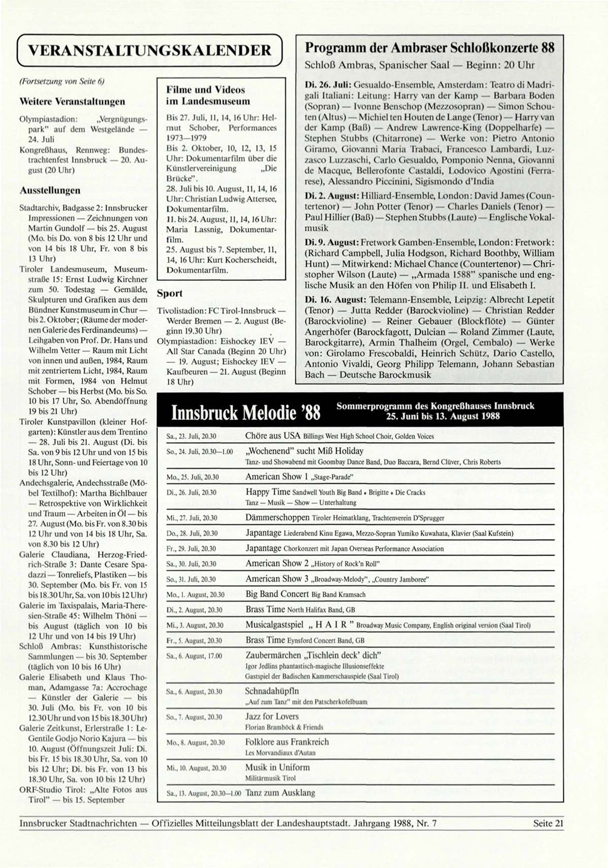 Innsbrucker Stadtnachrichten — Offizielles Mitteilungsblatt der Landeshauptstadt. Jahrgang 1988, Nr. 7