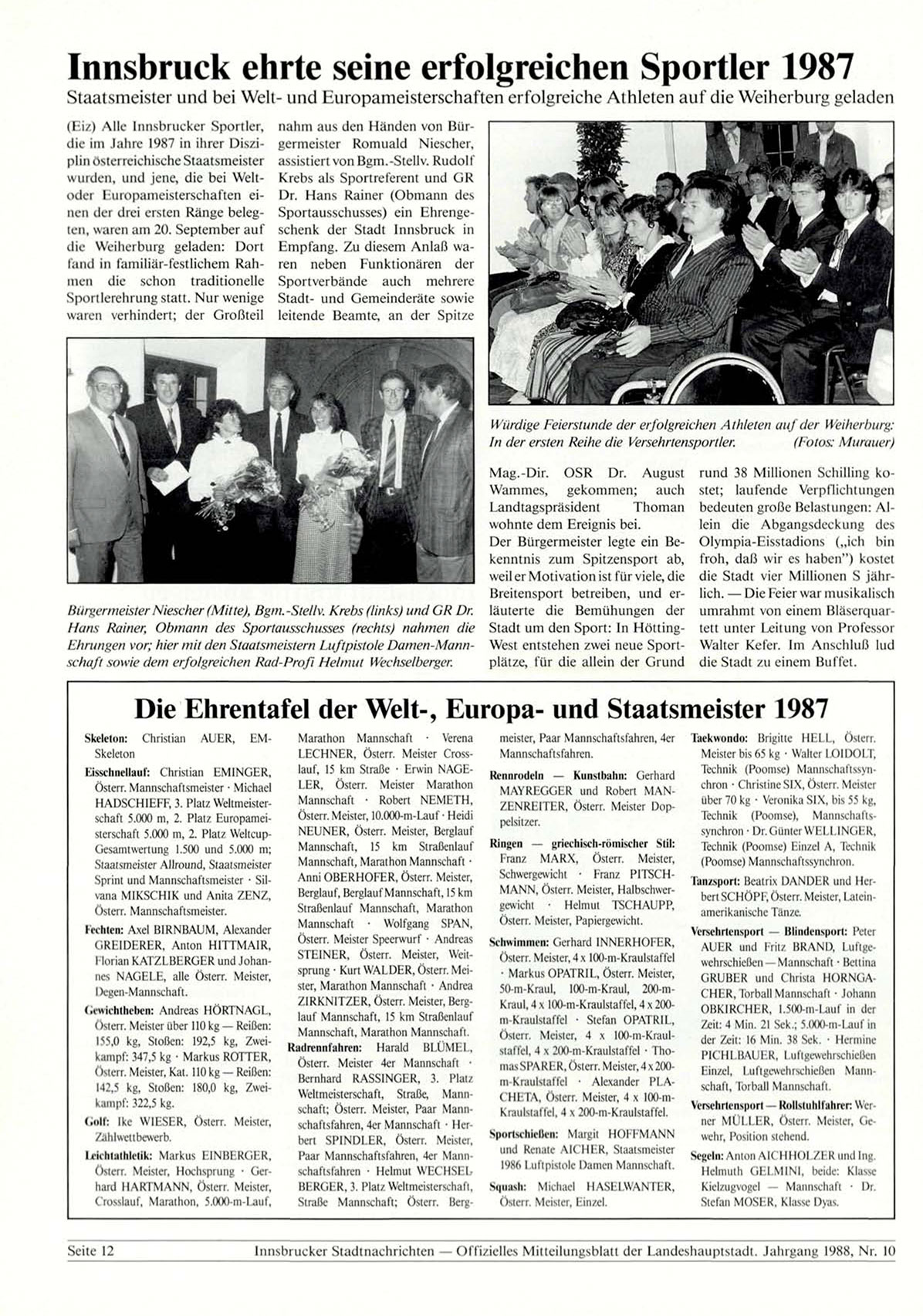 Innsbruck ehrte seine erfolgreichen Sportler 1987