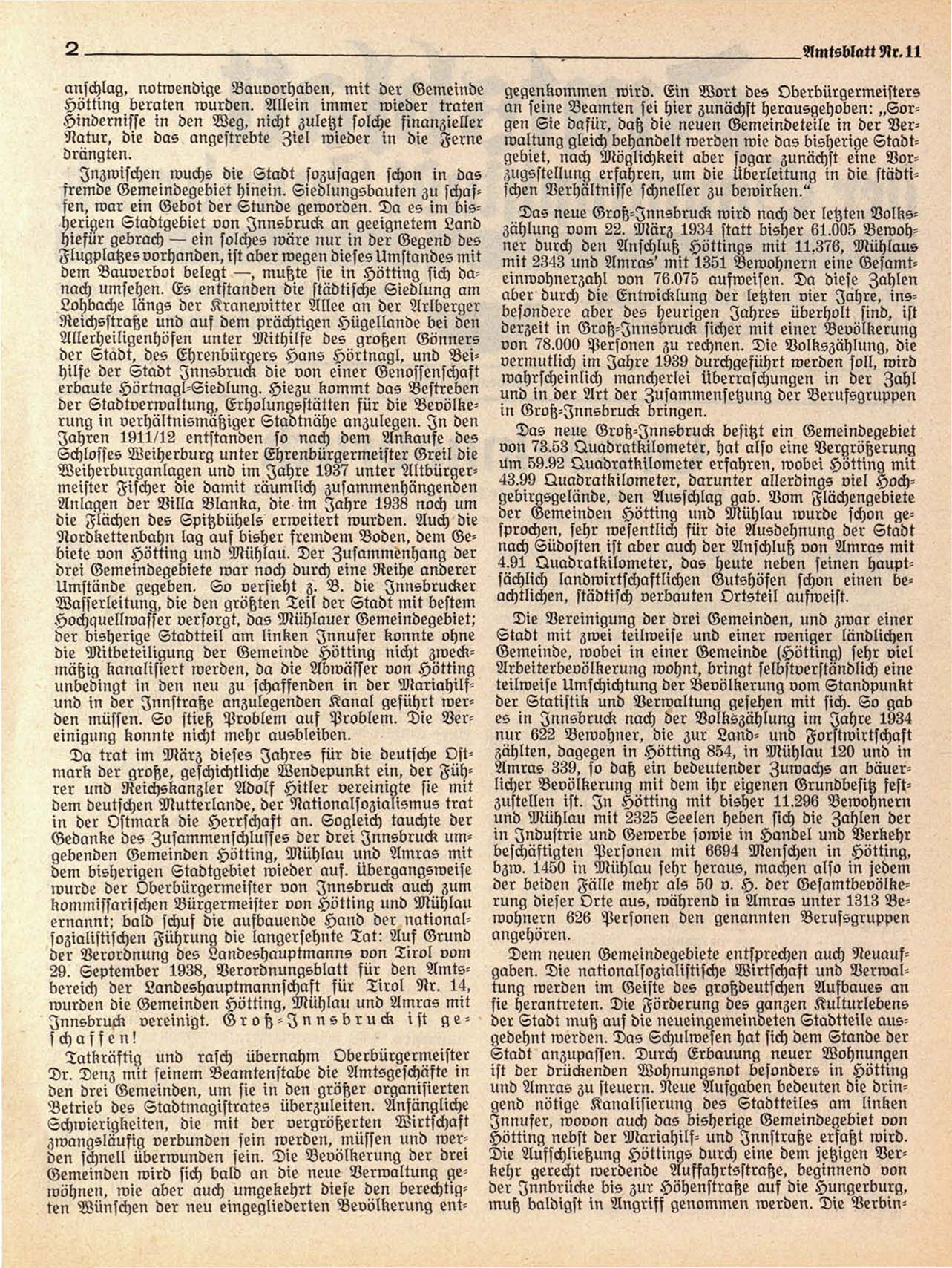 wurde der Oberbürgermeister von Innsbruck auch zum der beiden Fälle mehr als 50 o. H. der Gesamtbevölkekommissarischen Bürgermeister von Hötting und Mühlau rung dieser Orte aus, während in Amras unter 1313 Beernannt; bald schuf die aufbauende Hand der national- wohnern 626 Personen den genannten Berufsgruppen
