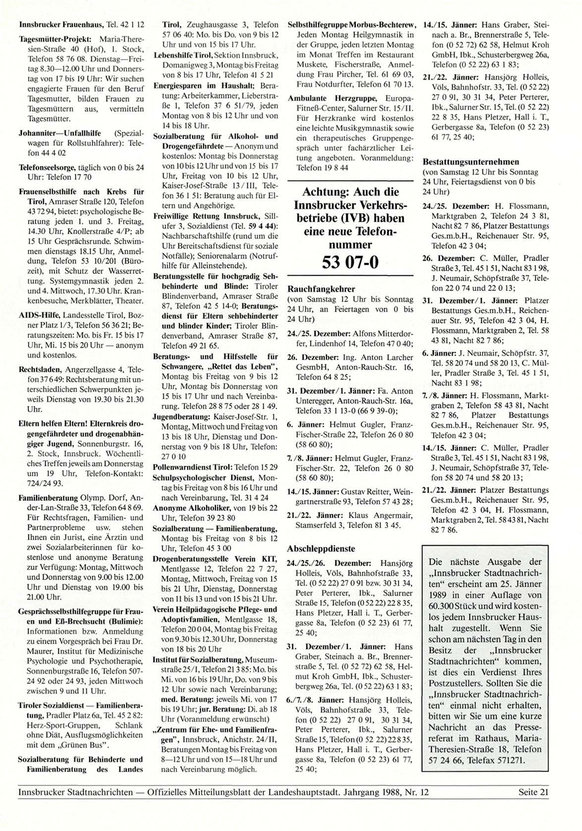 Innsbrucker Stadtnachrichten — Offizielles Mitteilungsblatt der Landeshauptstadt. Jahrgang 1988, Nr. 12