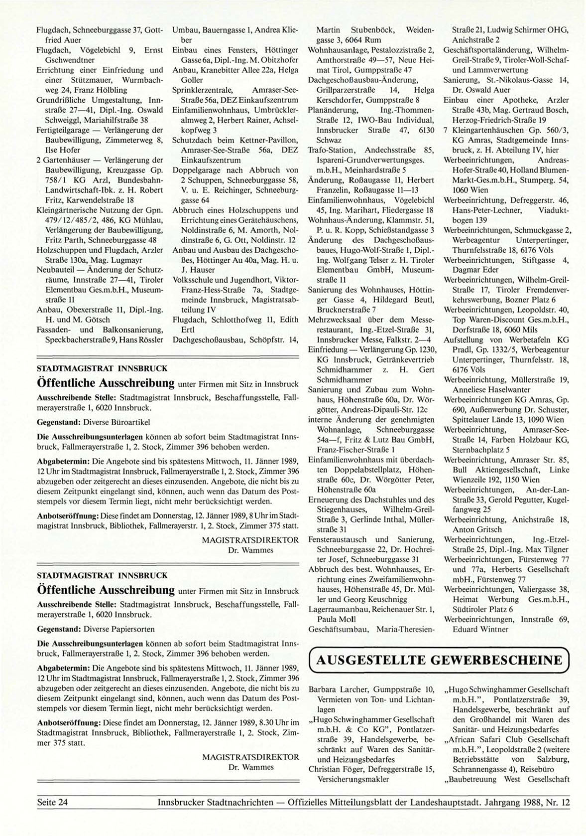 Innsbrucker Stadtnachrichten — Offizielles Mitteilungsblatt der Landeshauptstadt. Jahrgang 1988, Nr. 12