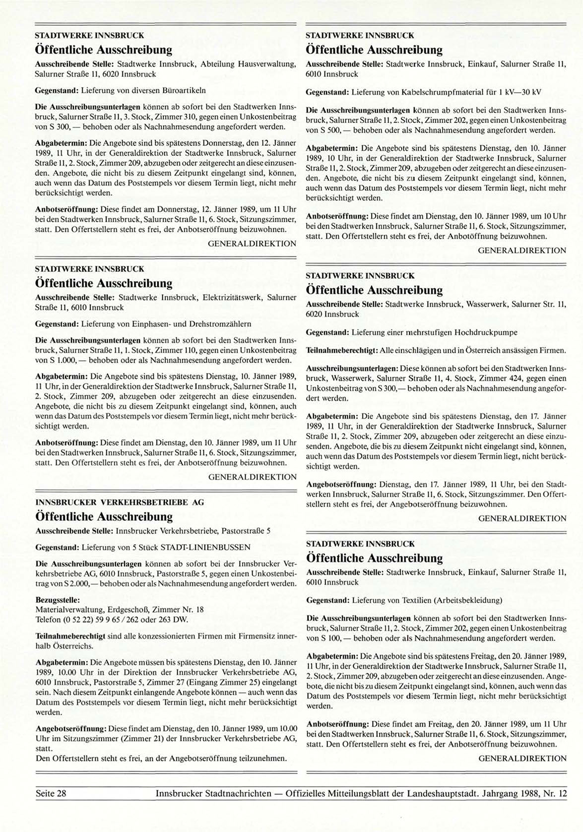 Angebotseröffnung: Dienstag, den 17. Jänner 1989, 11 Uhr, bei den Stadtwerken Innsbruck, Salurner Straße 11, 6. Stock, Sitzungszimmer. Den Offertstellern steht es frei, der Angebotseröffnung beizuwohnen.