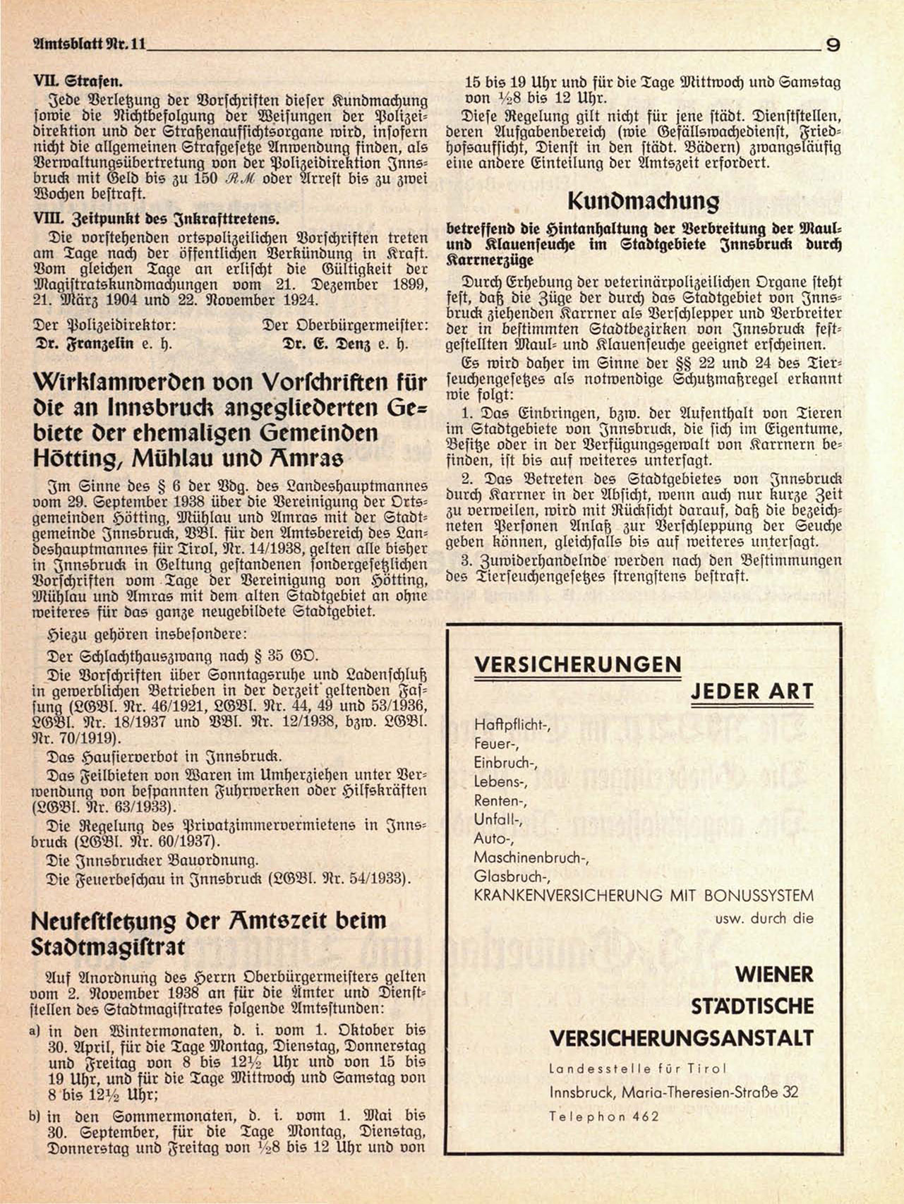 vom 29. September 1938 über die Vereinigung der Ortsgemeinden Hötting, Mühlau und Amras mit der Stadtgemeinde Innsbruck, VVl. für den Amtsbereich des Landeshauptmannes für Tirol, Nr. 14/1938, gelten alle bisher