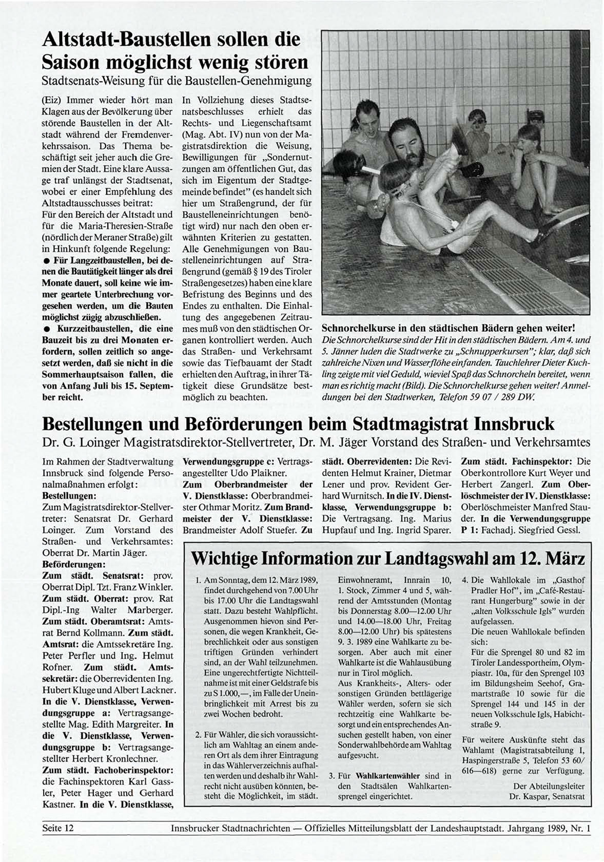 Innsbrucker Stadtnachrichten — Offizielles Mitteilungsblatt der Landeshauptstadt. Jahrgang 1989, Nr. 1
