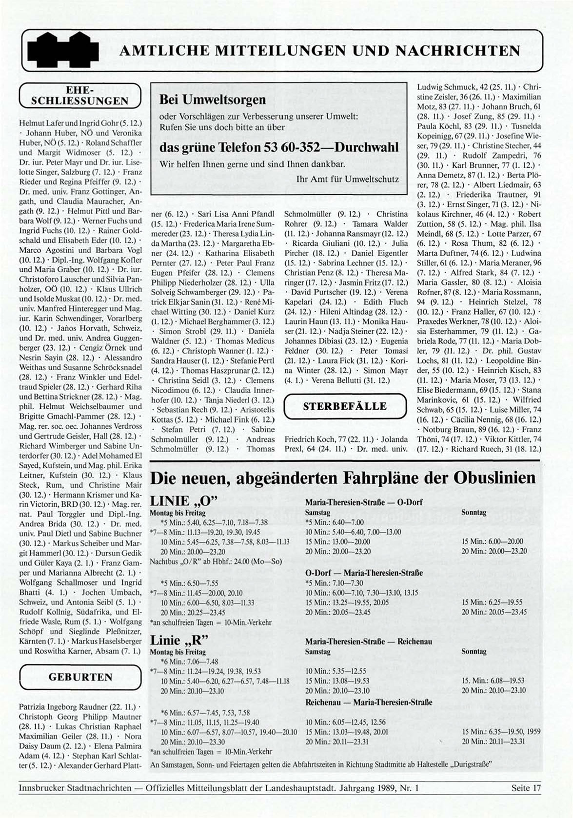 Innsbrucker Stadtnachrichten — Offizielles Mitteilungsblatt der Landeshauptstadt. Jahrgang 1989, Nr. 1