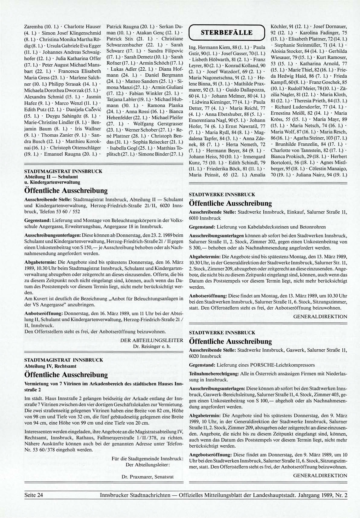 Innsbrucker Stadtnachrichten — Offizielles Mitteilungsblatt der Landeshauptstadt. Jahrgang 1989, Nr. 2