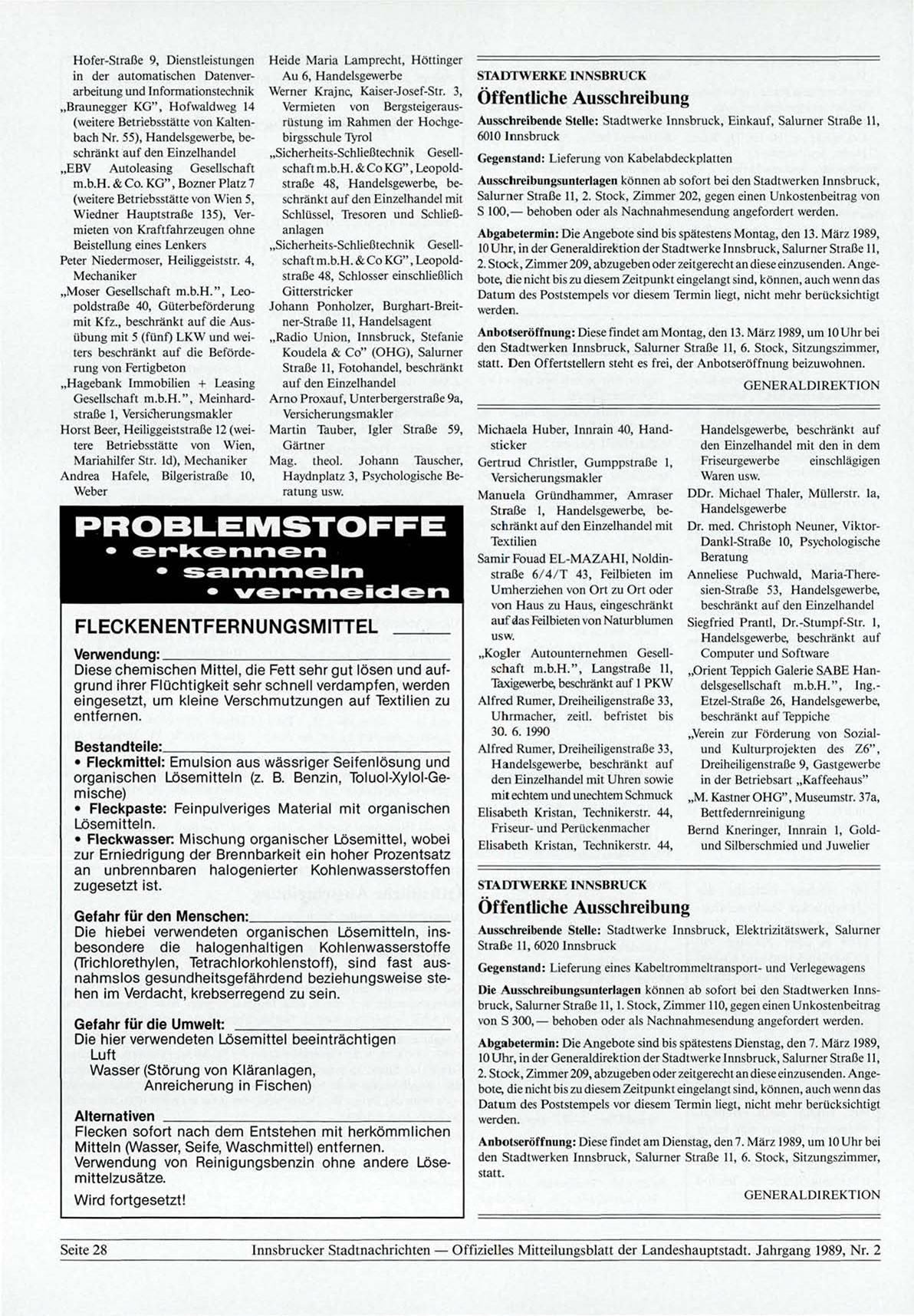 Innsbrucker Stadtnachrichten — Offizielles Mitteilungsblatt der Landeshauptstadt. Jahrgang 1989, Nr. 2