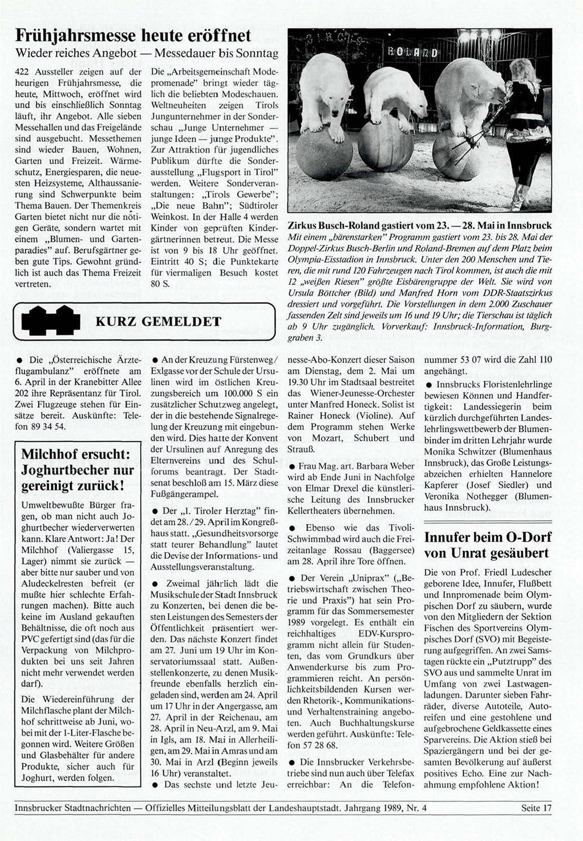 Innsbrucker Stadtnachrichten — Offizielles Mitteilungsblatt der Landeshauptstadt. Jahrgang 1989, Nr. 4