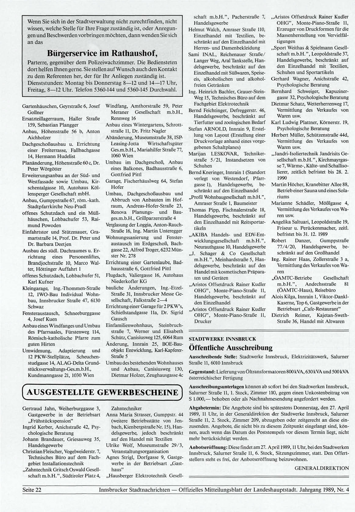 Innsbrucker Stadtnachrichten — Offizielles Mitteilungsblatt der Landeshauptstadt. Jahrgang 1989, Nr. 4