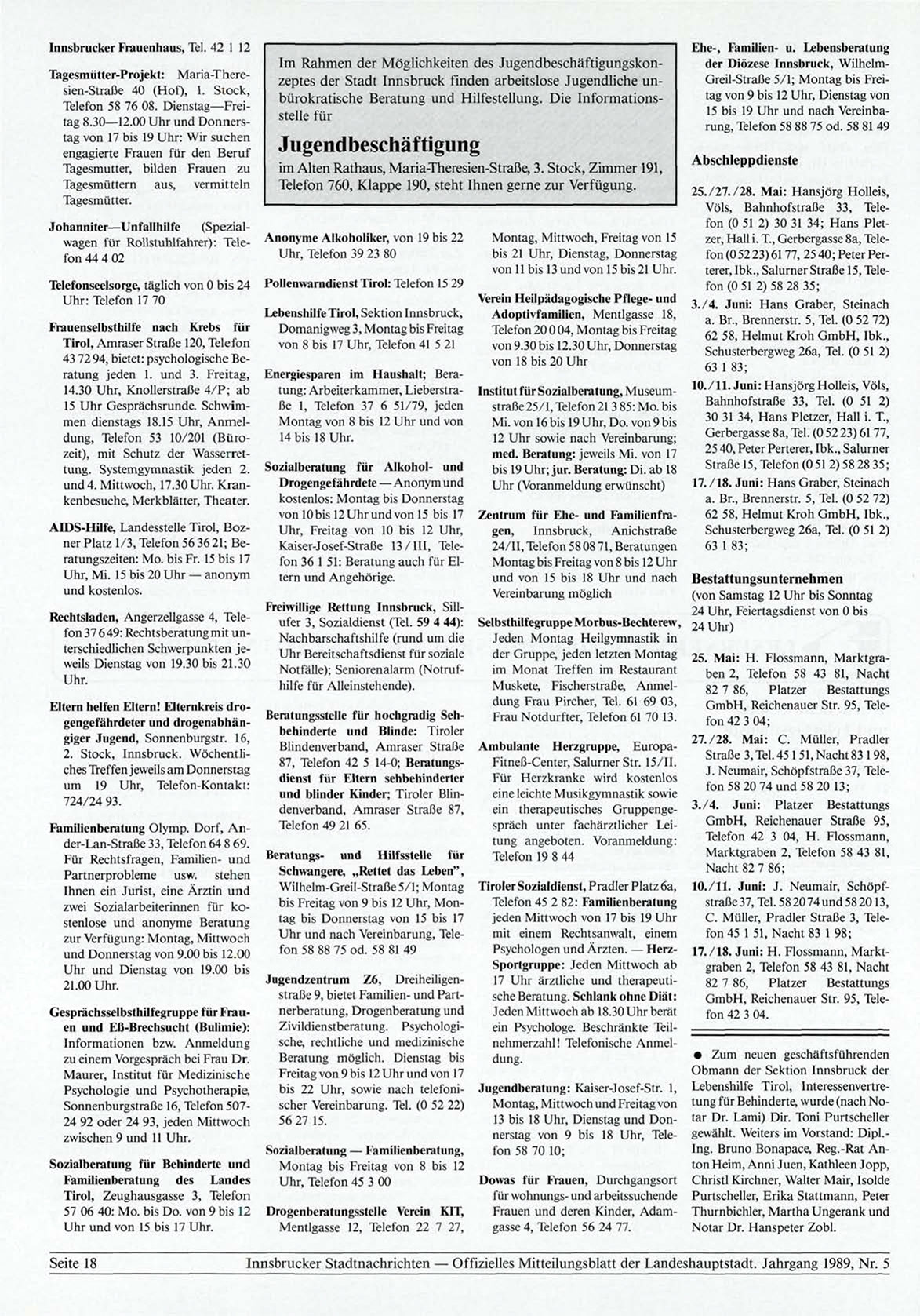 Innsbrucker Stadtnachrichten — Offizielles Mitteilungsblatt der Landeshauptstadt. Jahrgang 1989, Nr. 5