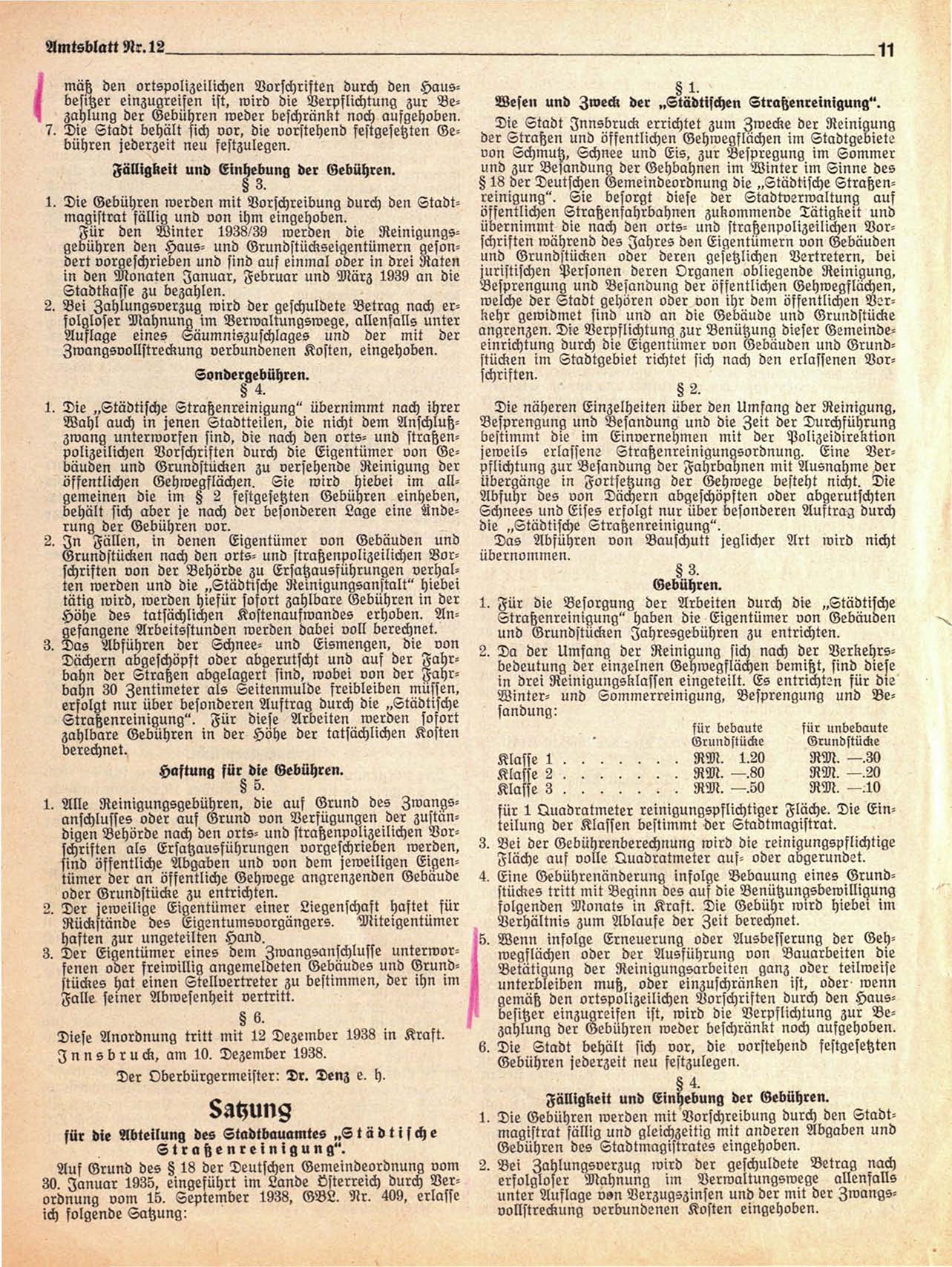 Für den Winter 1938/39 werden die Reinigungsgebühren den Haus- und Grundstückseigentümern gesondert vorgeschrieben und sind auf einmal oder in drei Raten
