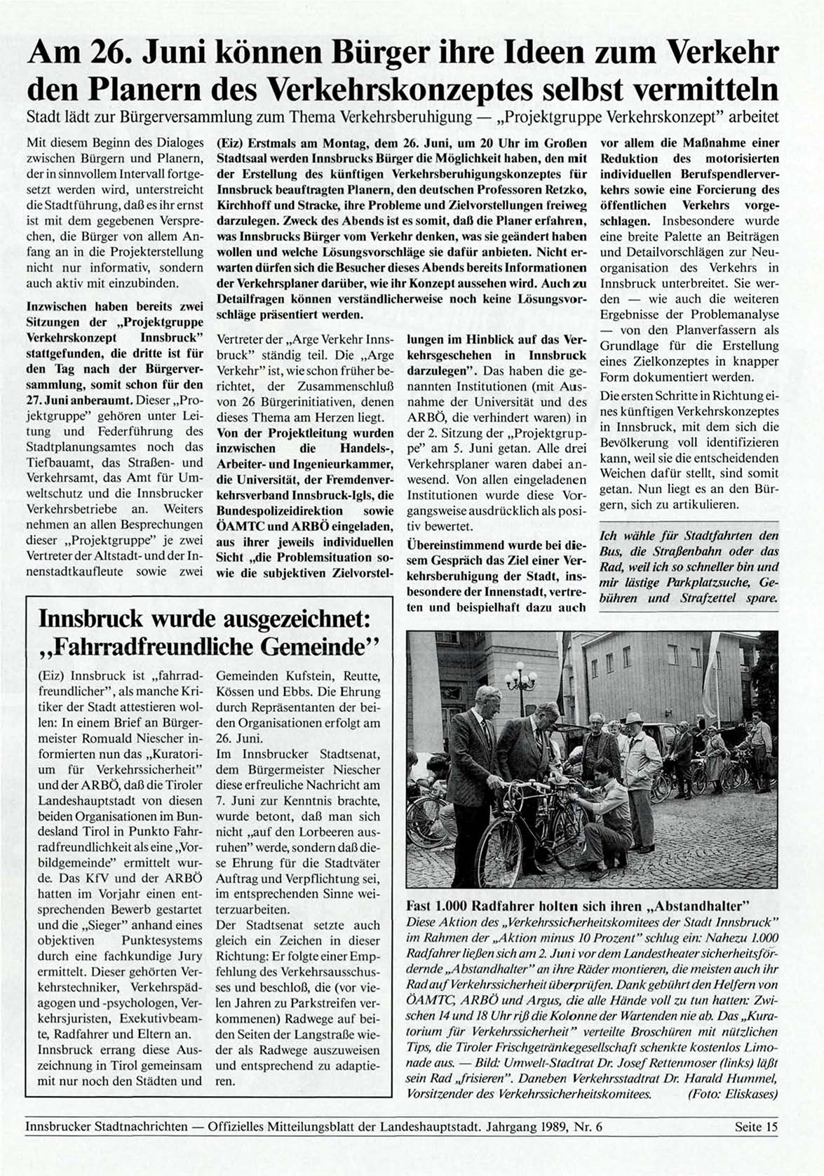 Innsbrucker Stadtnachrichten — Offizielles Mitteilungsblatt der Landeshauptstadt. Jahrgang 1989, Nr. 6
