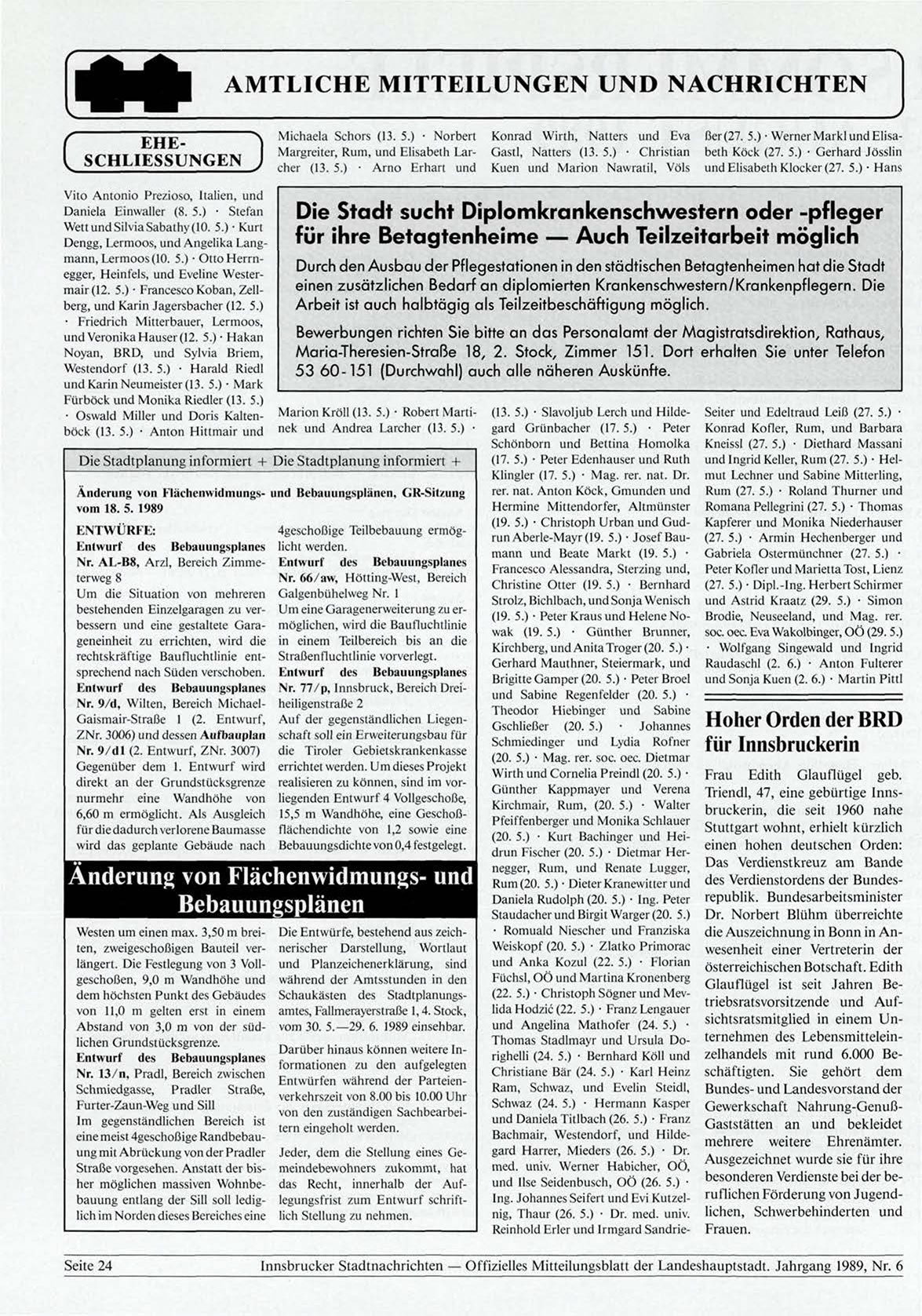 Innsbrucker Stadtnachrichten — Offizielles Mitteilungsblatt der Landeshauptstadt. Jahrgang 1989, Nr. 6