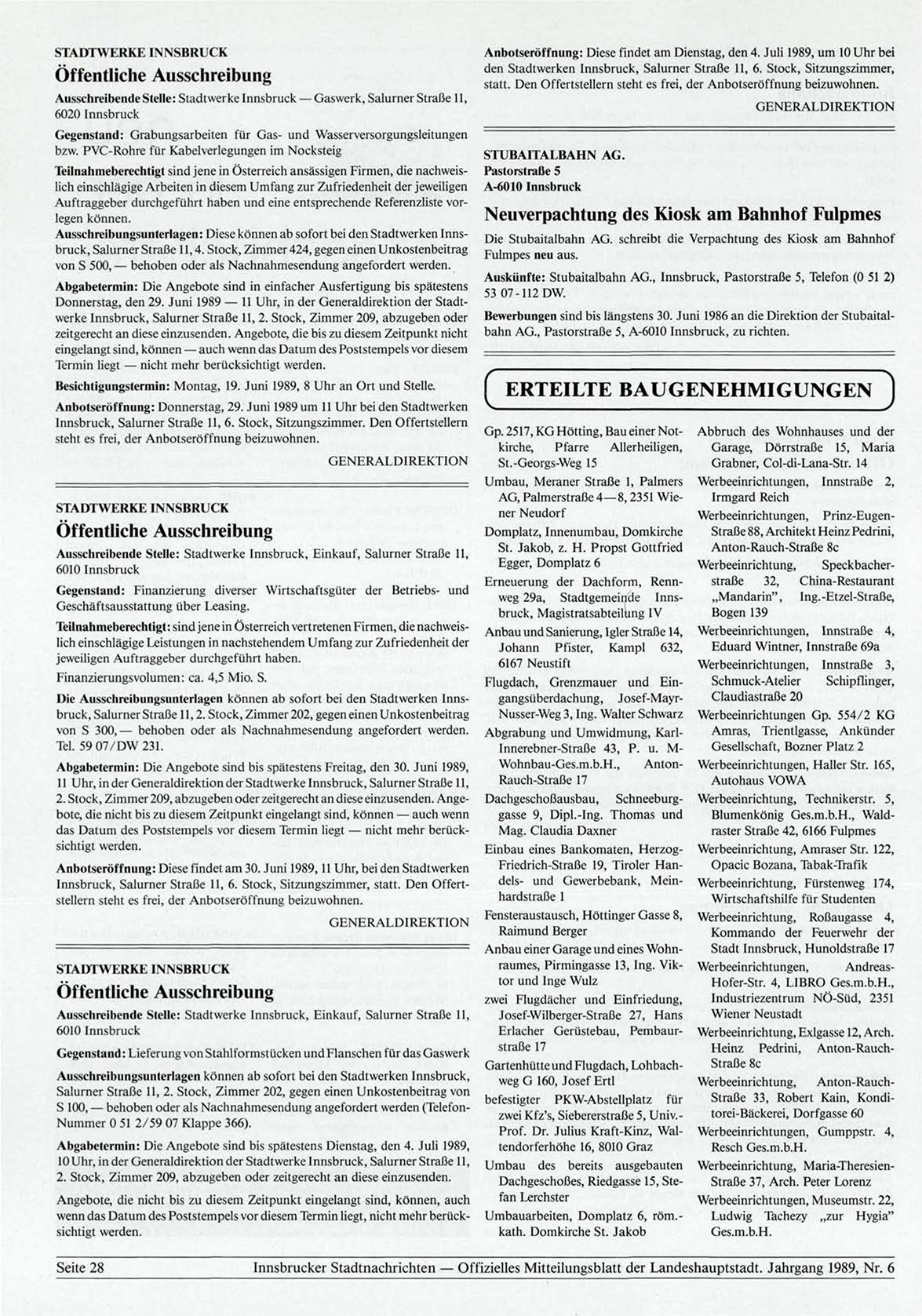 Donnerstag, den 29. Juni 1989 — 11 Uhr, in der Generaldirektion der Stadtwerke Innsbruck, Salurner Straße 11, 2. Stock, Zimmer 209, abzugeben oder