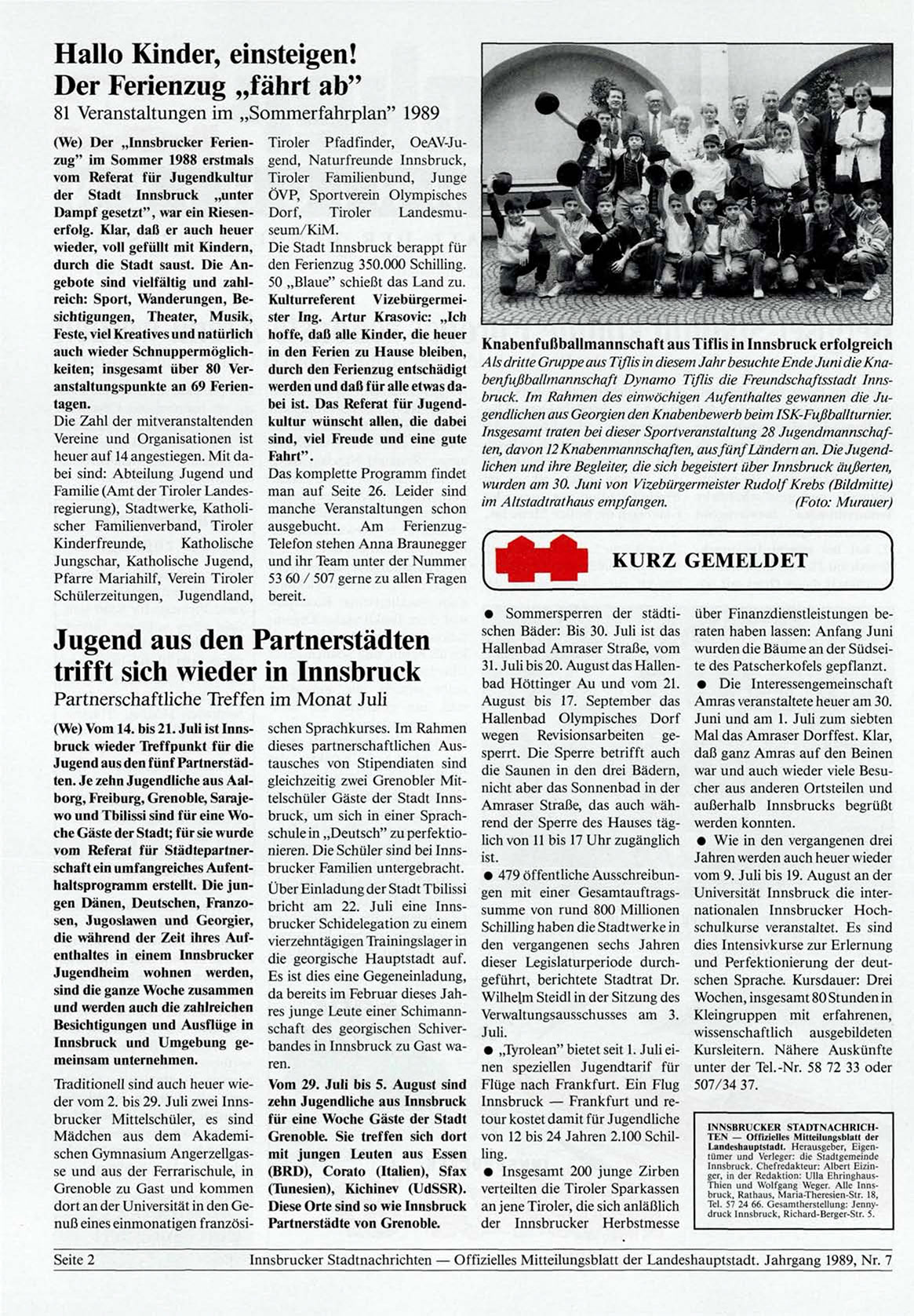Innsbrucker Stadtnachrichten — Offizielles Mitteilungsblatt der Landeshauptstadt. Jahrgang 1989, Nr. 7