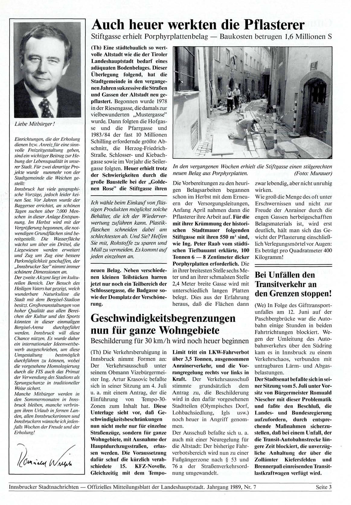 Innsbrucker Stadtnachrichten — Offizielles Mitteilungsblatt der Landeshauptstadt. Jahrgang 1989, Nr. 7