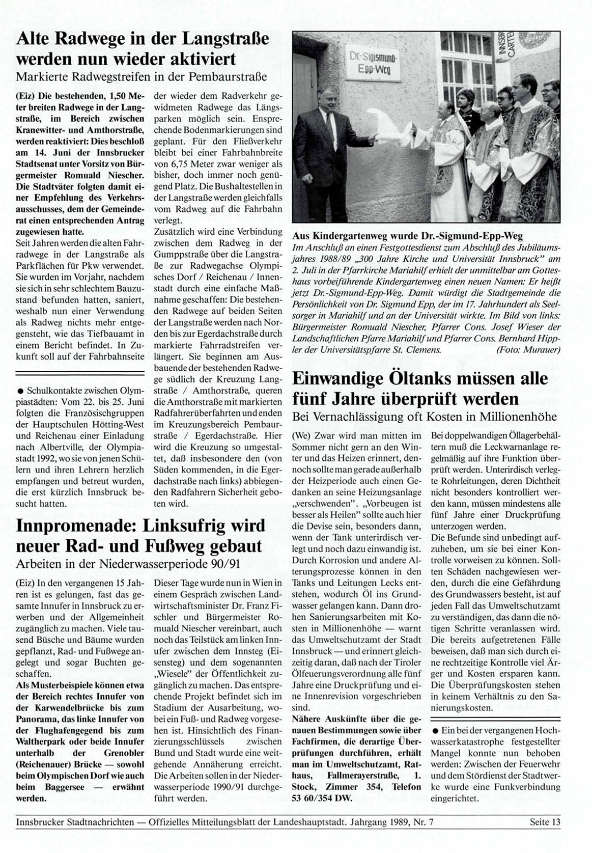 Innsbrucker Stadtnachrichten — Offizielles Mitteilungsblatt der Landeshauptstadt. Jahrgang 1989, Nr. 7