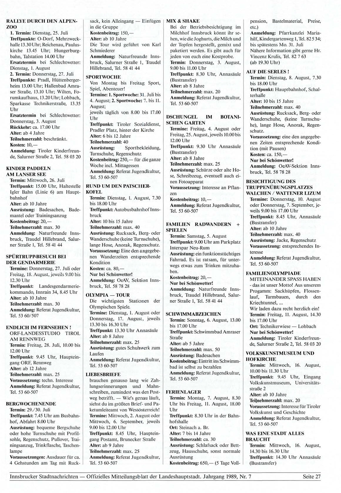 Innsbrucker Stadtnachrichten — Offizielles Mitteilungsblatt der Landeshauptstadt. Jahrgang 1989, Nr. 7