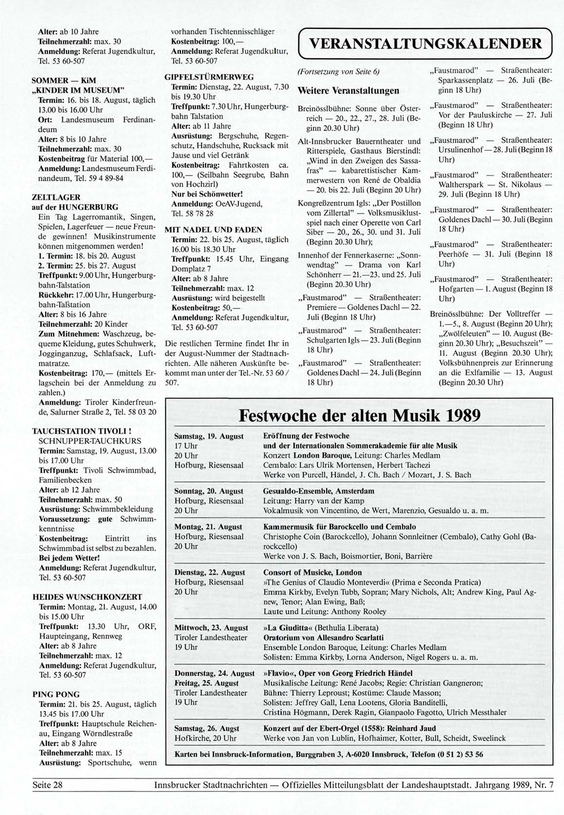 Innsbrucker Stadtnachrichten — Offizielles Mitteilungsblatt der Landeshauptstadt. Jahrgang 1989, Nr. 7