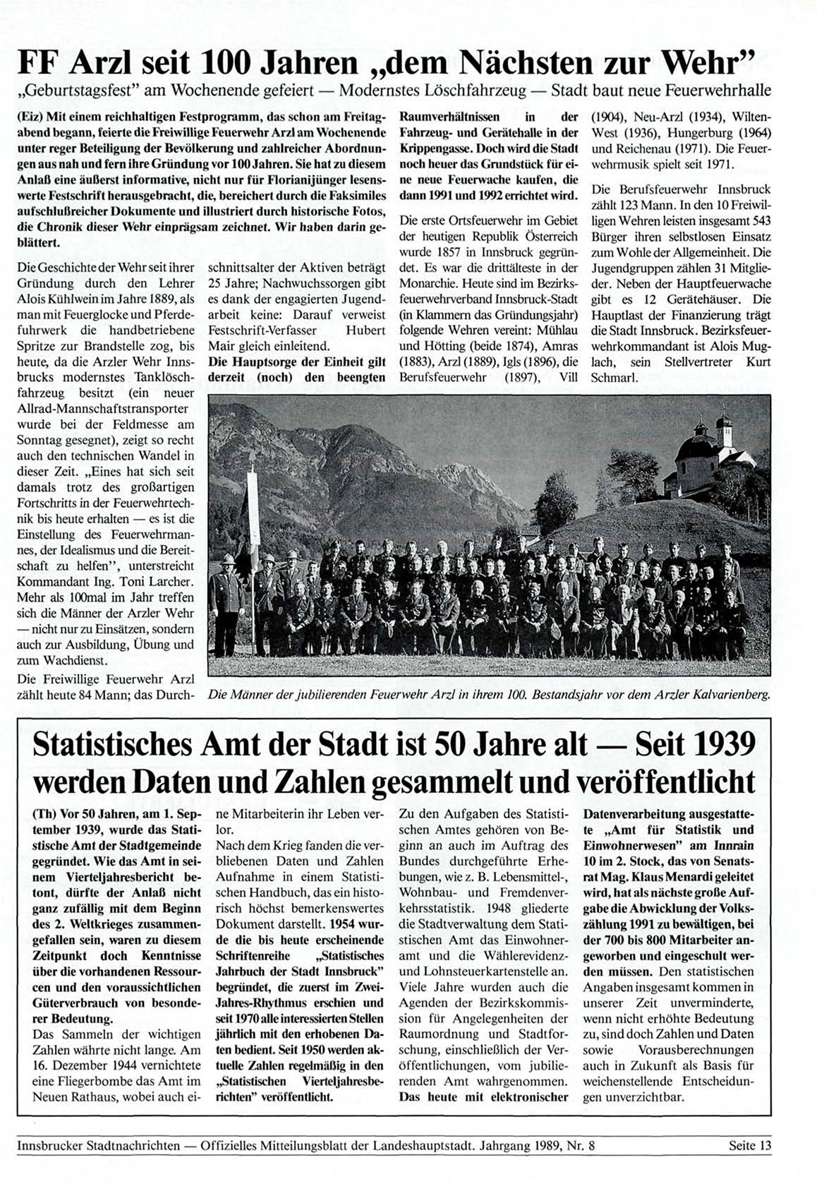 Innsbrucker Stadtnachrichten — Offizielles Mitteilungsblatt der Landeshauptstadt. Jahrgang 1989, Nr. 8