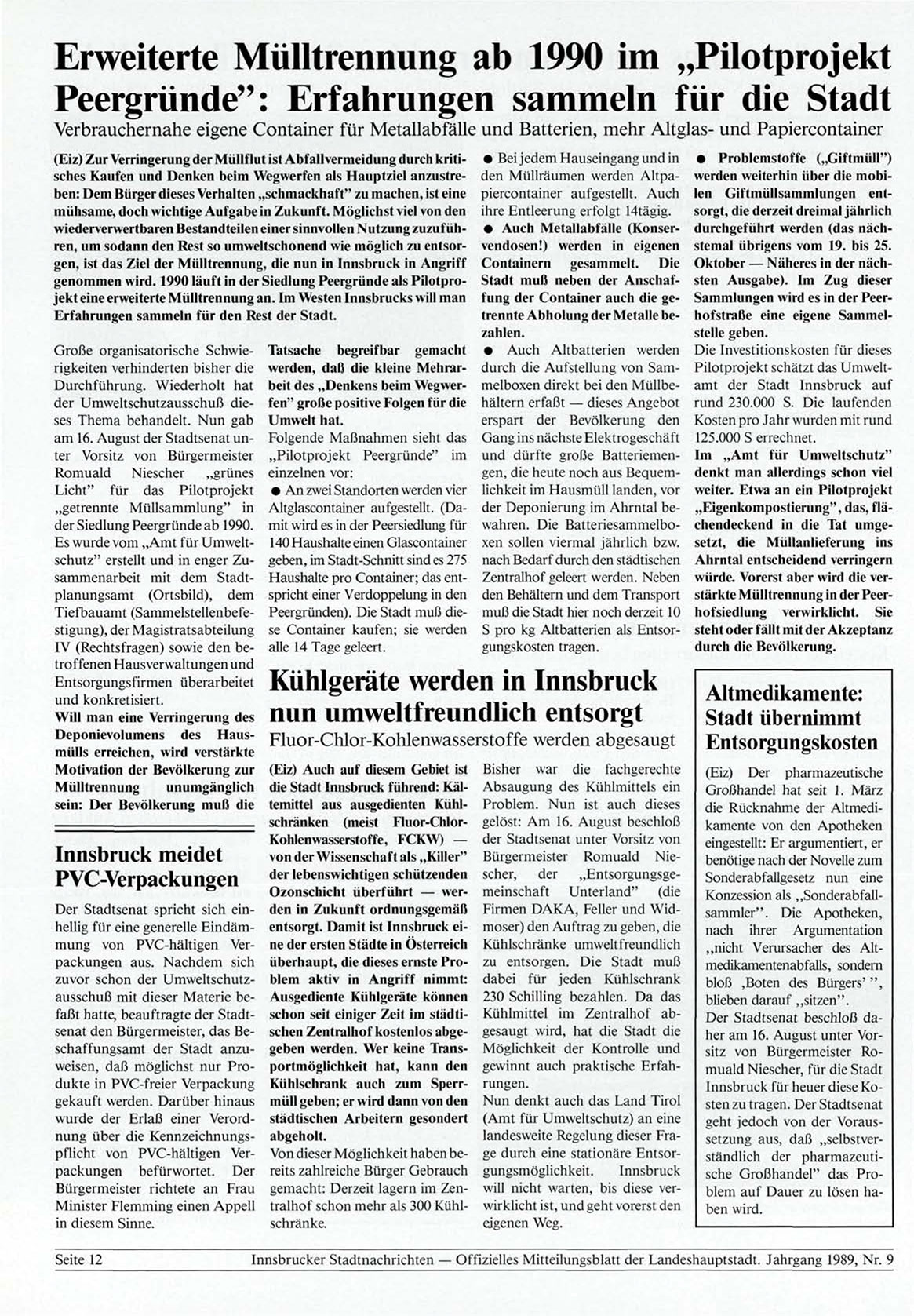 genommen wird. 1990 läuft in der Siedlung Peergründe als Pilotprojekt eine erweiterte Mülltrennung an. Im Westen Innsbrucks will man