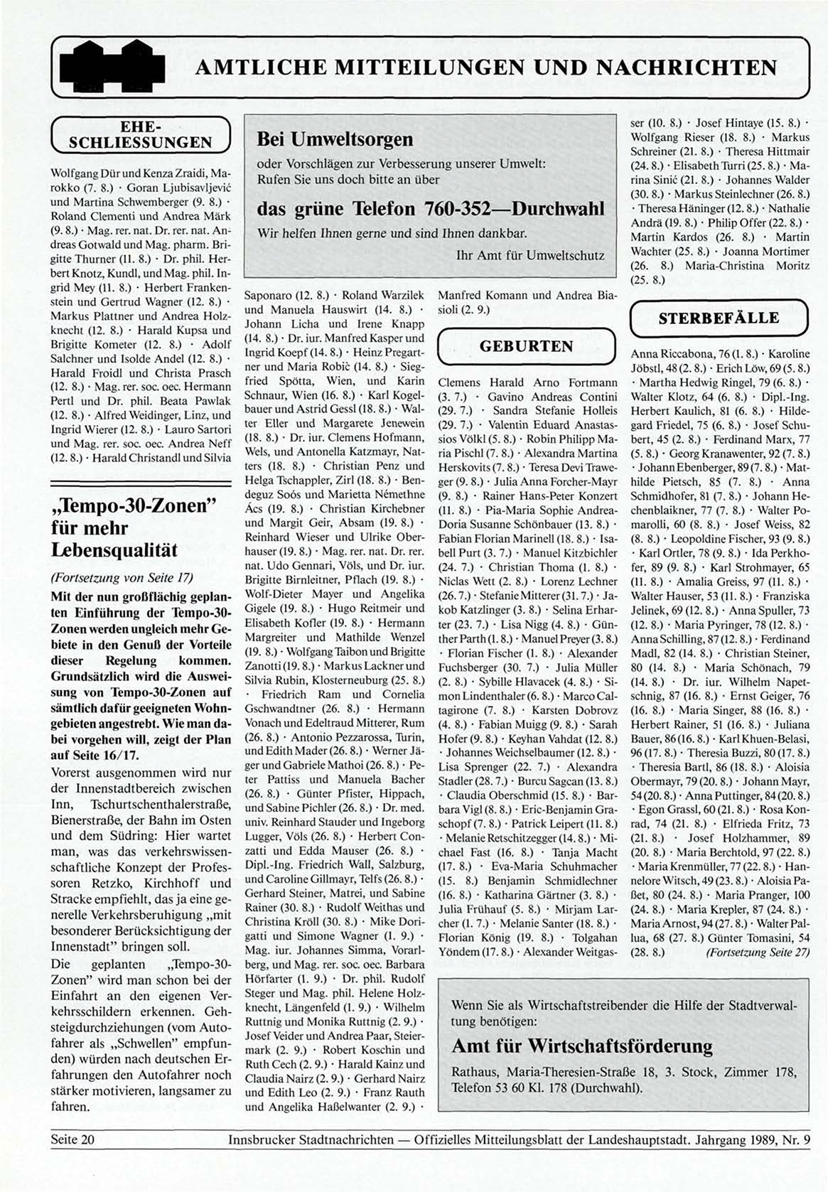 Innsbrucker Stadtnachrichten — Offizielles Mitteilungsblatt der Landeshauptstadt. Jahrgang 1989, Nr. 9