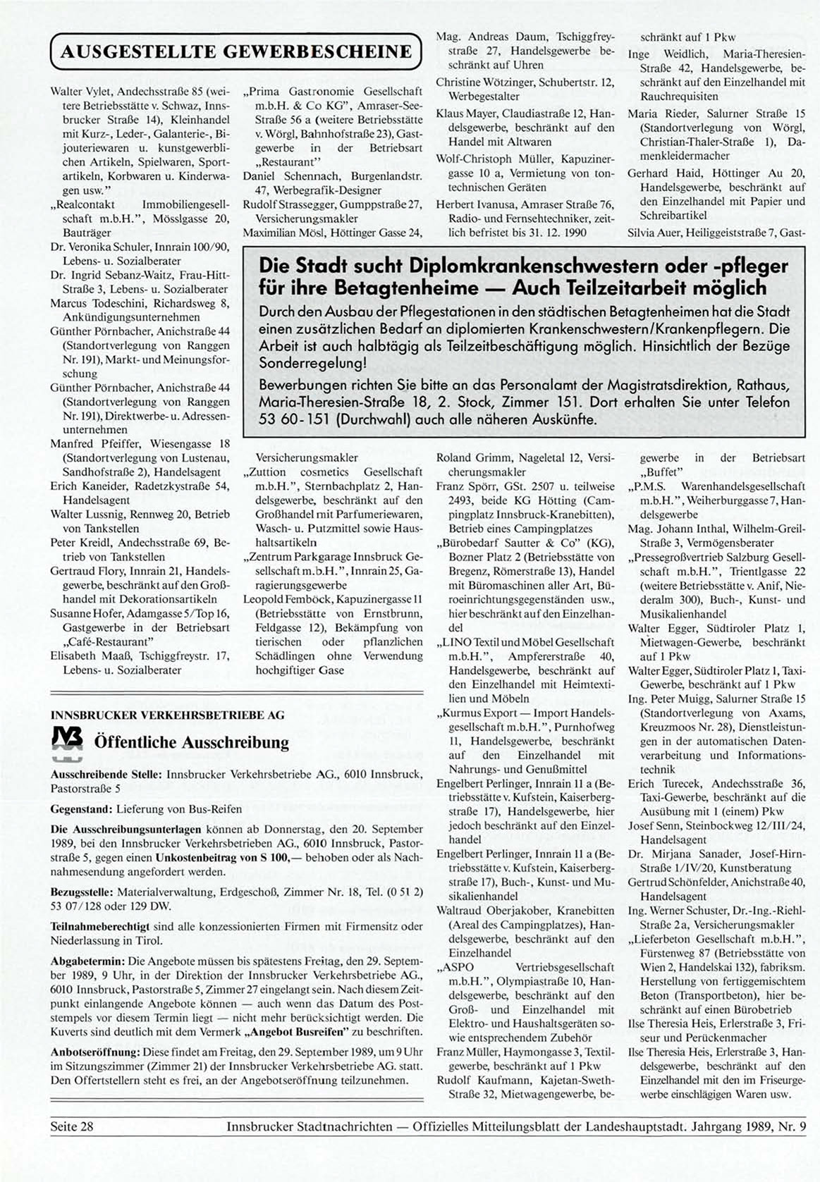 Innsbrucker Stadtnachrichten — Offizielles Mitteilungsblatt der Landeshauptstadt. Jahrgang 1989, Nr. 9